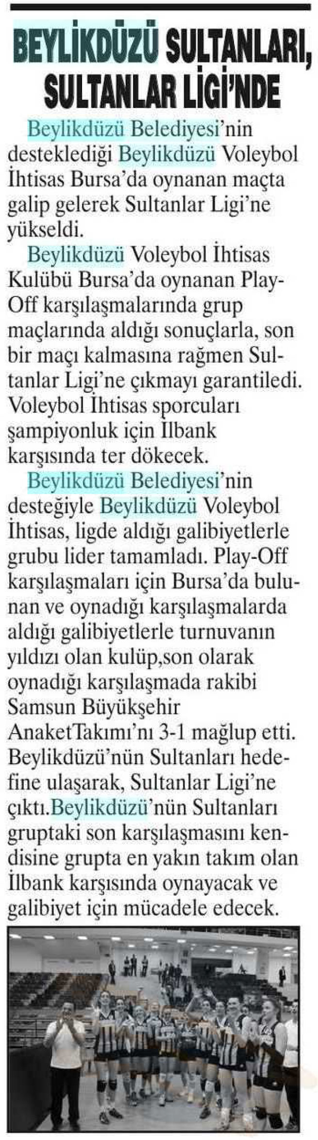 2 Nisan 2017 tarihli "YURT HABER" gazetesi. Beylikdüzü Belediyesi'nin desteklediği Beylikdüzü Voleybol İhtisas Bursa'da oynanan maçta galip gelerek Sultanlar Ligi'ne yükseldi.