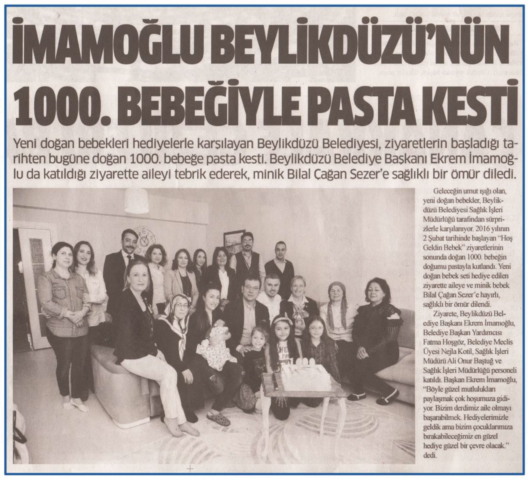 3 Nisan 2017 tarihli "YENİ GÜN" gazetesi. Yeni doğan bebekleri hediyelerle karşılayan Beylikdüzü Belediyesi, ziyaretlerin başladığı tarihten bugüne doğan 1000. bebeğe pasta kesti. Beylikdüzü Belediye Başkanı Ekrem İmamoğlu'da katıldığı ziyarette aileyi tebrik ederek. minik Bilal Çağan Sezer'e sağlıklı bir ömür diledi.