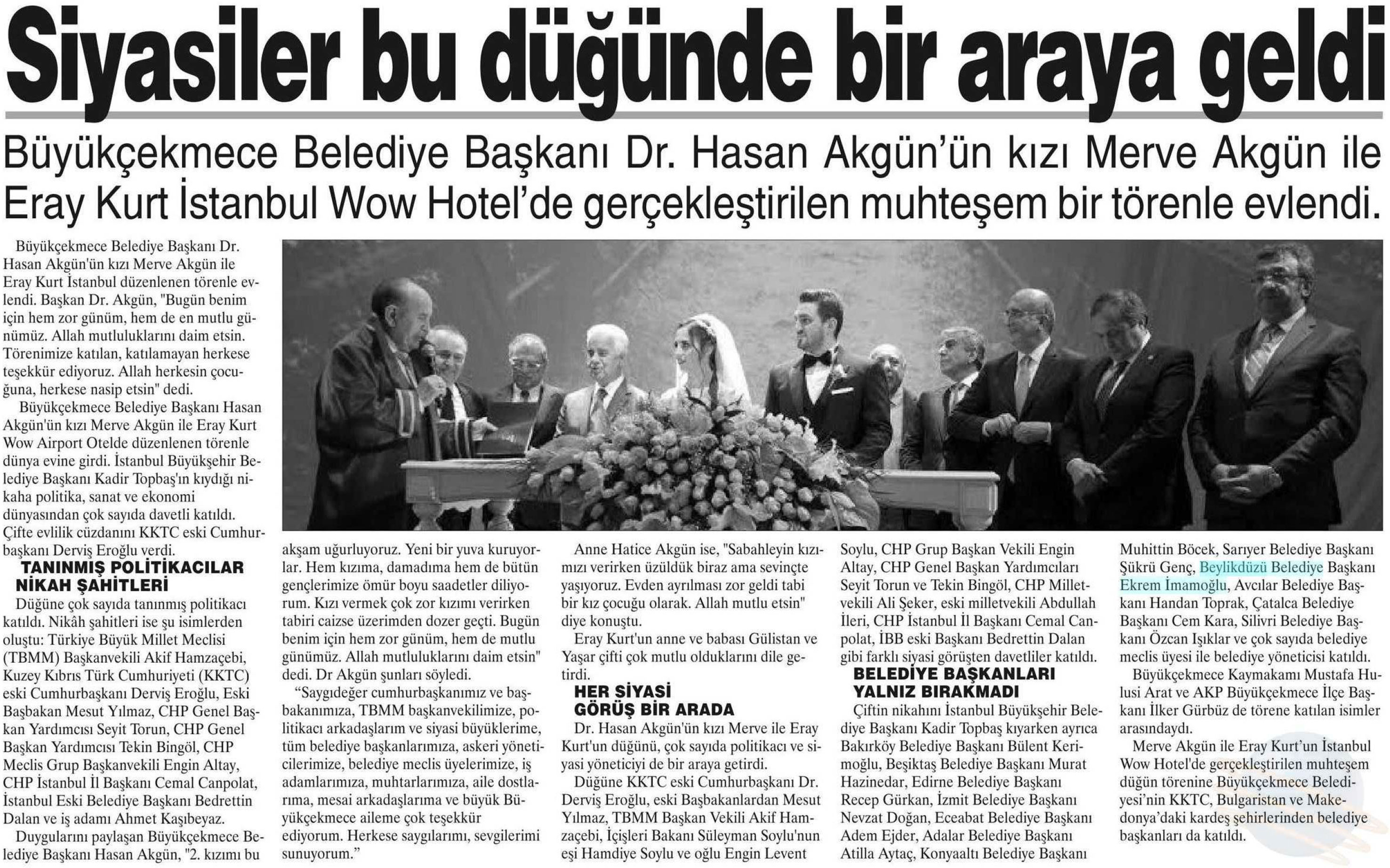5 Nisan 2017 tarihli "BÜYÜKÇEKMECE" gazetesi. Büyükçekmece Belediye Başkanı Dr.Hsan Akgün'ün kızı ile Eray Kurt İstanbul Wow Hotel'de gerçekleştirilen muhteşem bir törenle evlendi. Törene, Beylikdüzü Belediye Başkanı Ekrem İmamoğlu 'da katıldı.