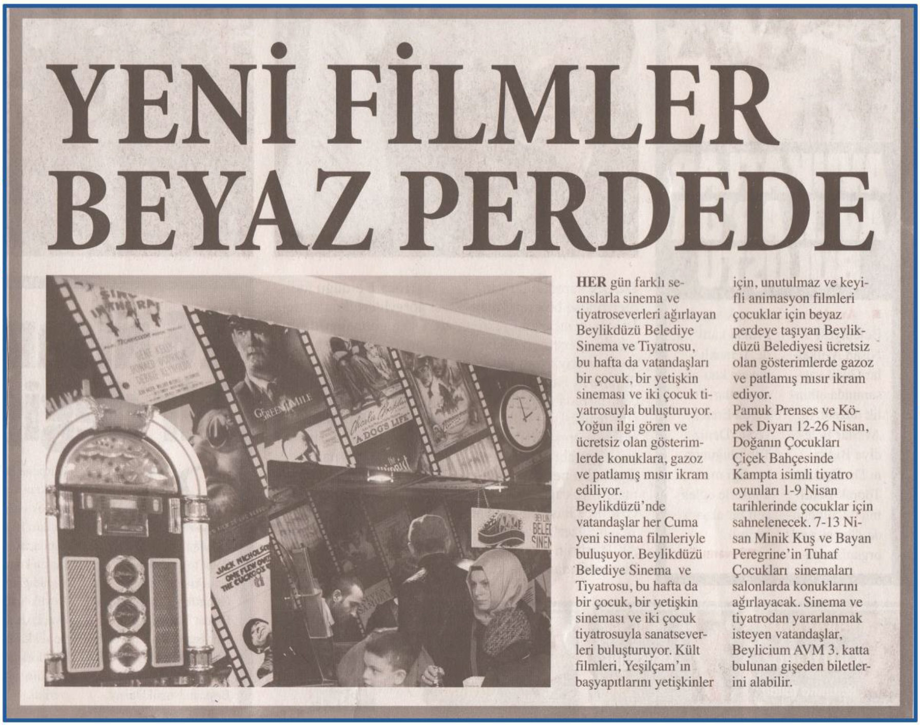 11 Nisan 2017 tarihli " TEKİN HABER" gazetesi. Beylikdüzü Belediye Sinema ve Tiyatrosu, vatandaşları bir çocuk bir yetişkin sineması ve iki çocuk tiyatrosuyla buluşturuyor.