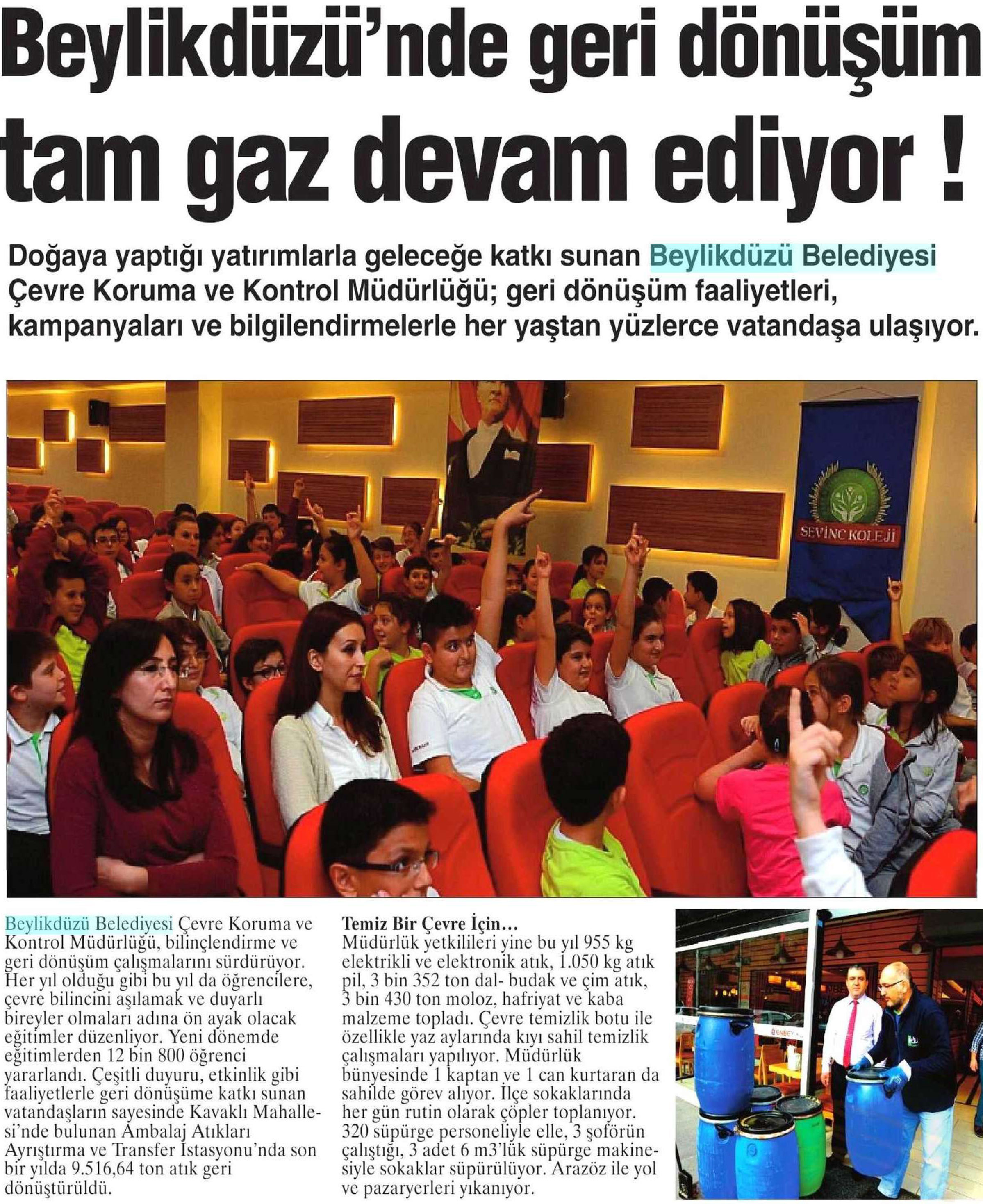 12 Nisan 2017 tarihli "NABIZ" gazetesi. Doğaya yaptığı yatırımlarla geleceğe katkı sunan Beylikdüzü Belediyesi Çevre Koruma ve Kontrol Müdürlüğü; geri dönüşüm faaliyetleri,kampanyaları ve bilgilendirmelerle her yaştan yüzlerce vatandaşa ulaşıyor.