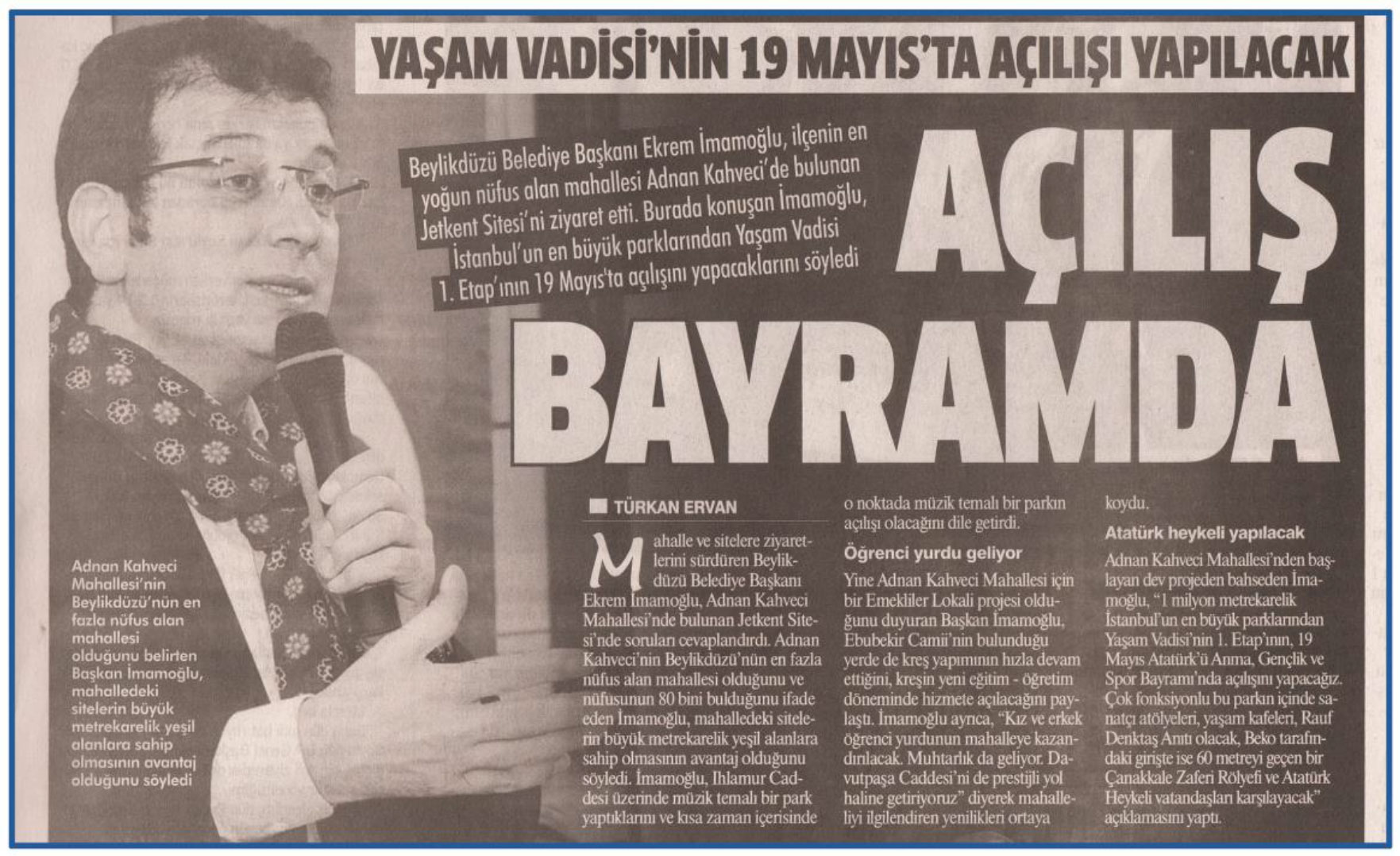 14 Nisan 2017 tarihli "GAZETEM İSTANBUL" gazetesi. Beylikdüzü Belediye Başkanı Ekrem İmamoğlu, ilçenin en yoğun nüfus alan mahallesi Adnan Kahveci'de bulunan Jetkent Sitesi'ni ziyaret etti. Burada konuşan İmamoğlu, İstanbul'un en büyük parklarından Yaşam Vadisi 1. Etap'ının 19 Mayıs'ta açılacağını söyledi.