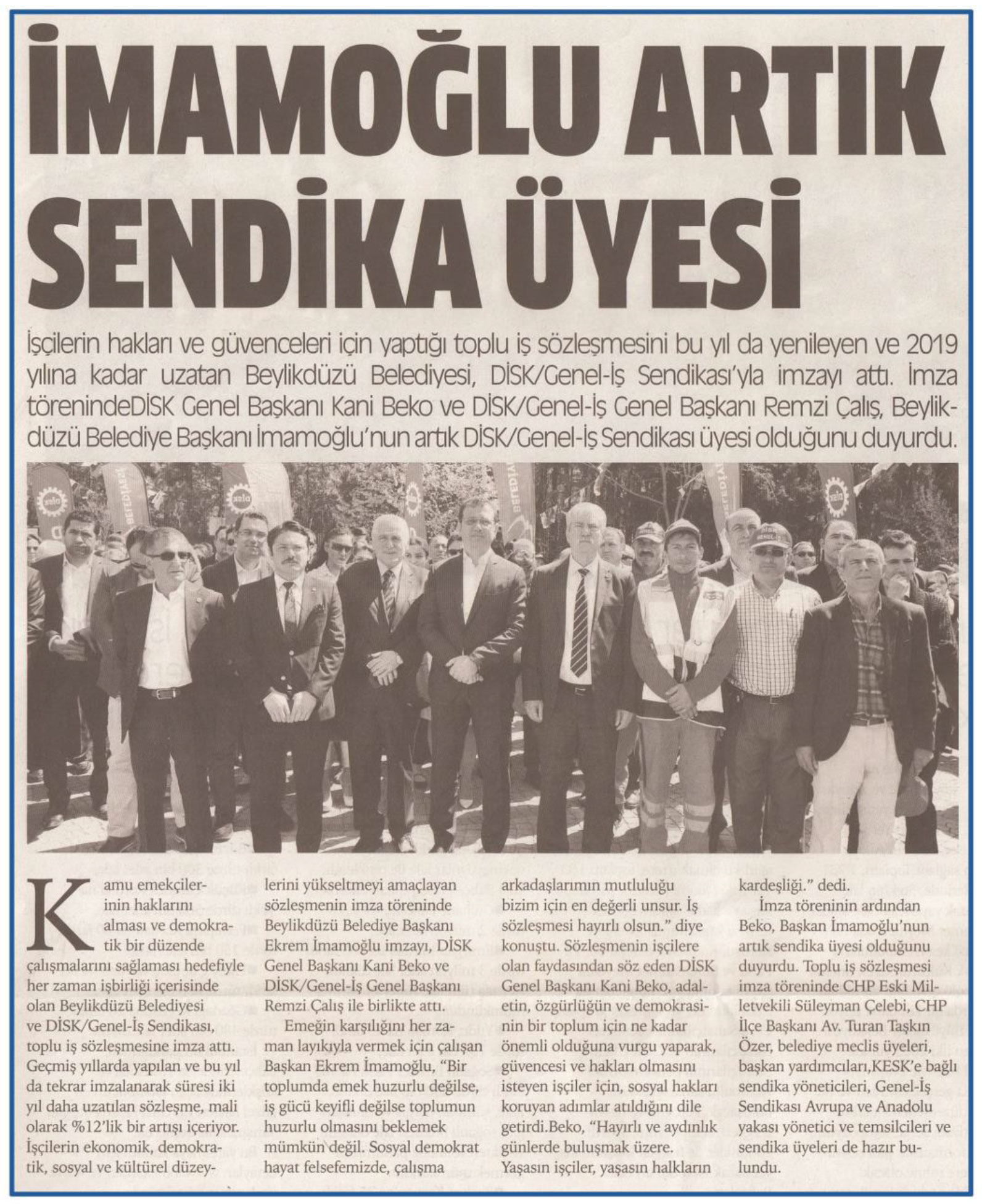18 Nisan 2017 tarihli "HABERCİ" gazetesi. İşçilerin hakları ve güvenceleri için yaptığı toplu iş sözleşmesini bu yıl da yenileyen ve 2010 yılına kadar uzatan Beylikdüzü Belediyesi, DİSK/Genel-İş Sendikası'yla imzayı attı. İmza töreninde DİSK Genel Başkanı Kani Beko ve DİSK/Genel-İş Genel Başkanı Remzi Çalış, Beylikdüzü Belediye Başkanı İmamoğlu'nun artık DİSK/Genel-İş Sendikası üyesi olduğunu duyurdu.