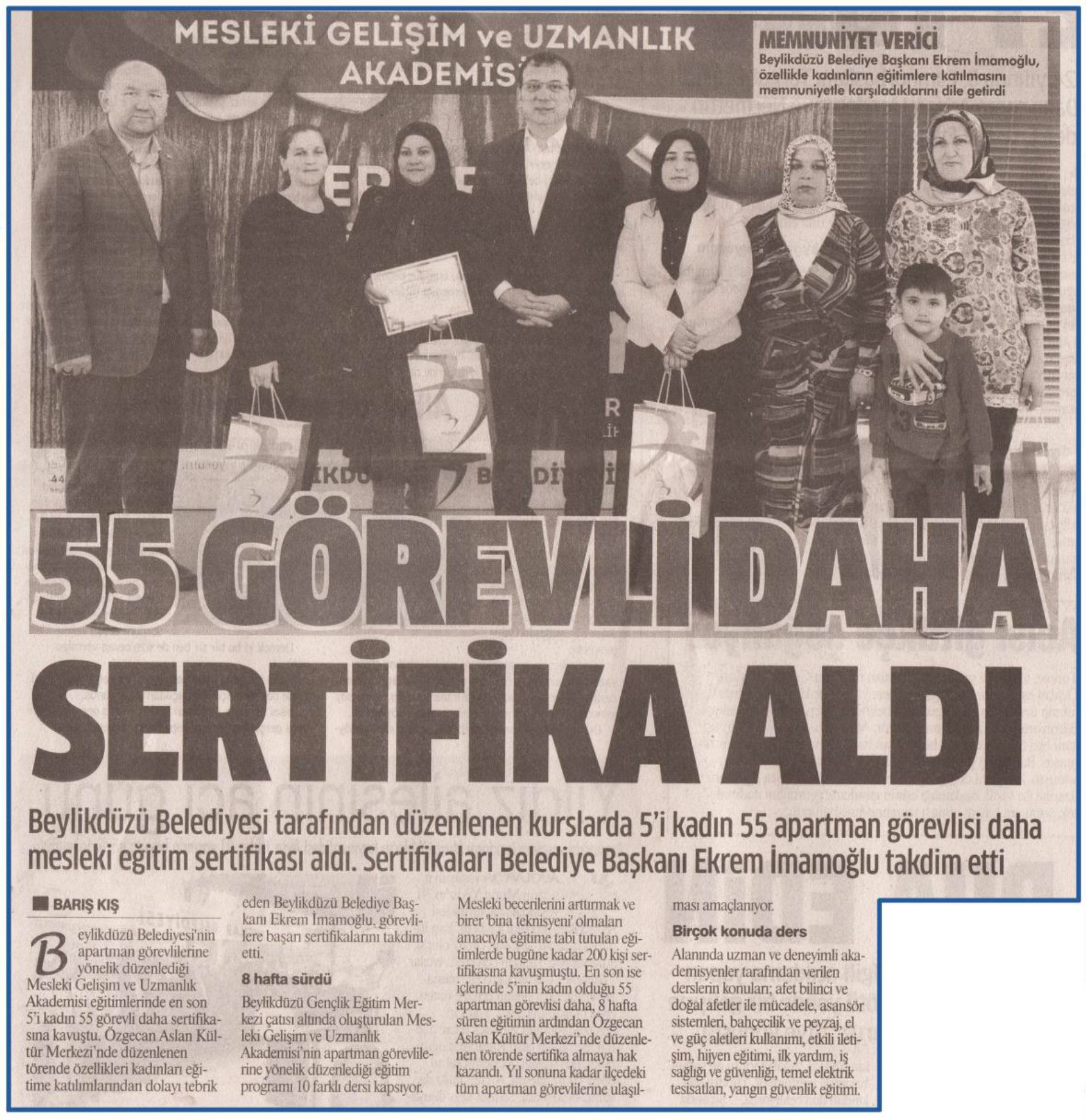 18 Nisan 2017 tarihli "GAZETEM İSTANBUL" gazetesi. Beylikdüzü Belediyesi tarafından düzenlenen kurslarda 5'i kadın 55 apartman görevlisi daha mesleki eğitim sertifikası aldı. Sertifikaları Belediye Başkanı Ekrem İmamoğlu takdim etti.