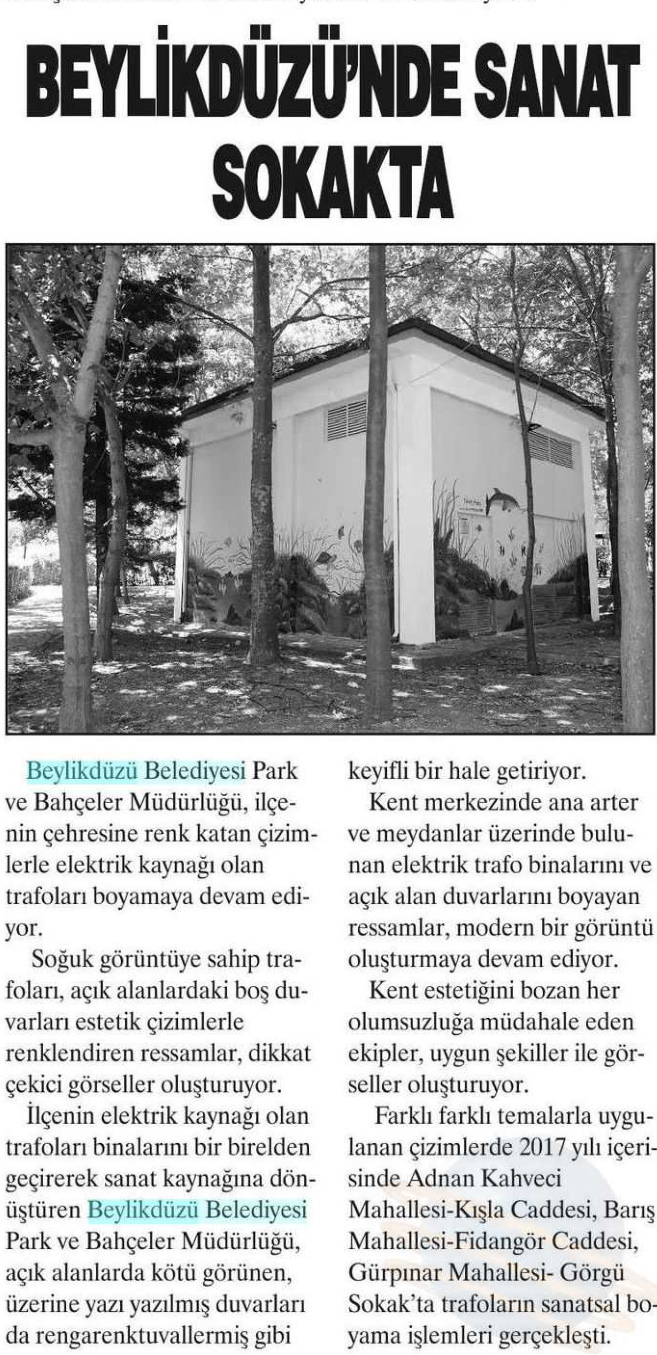 5 Temmuz 2017 tarihli "YURT HABER" gazetesi. Beylikdüzü Belediyesi Park ve Bahçeler Müdürlüğü açık alanlarda kötü görünen, üzerine yazı yazılmış duvarları da rengarenk tuvaller gibi keyifli bir hale getiriyor.