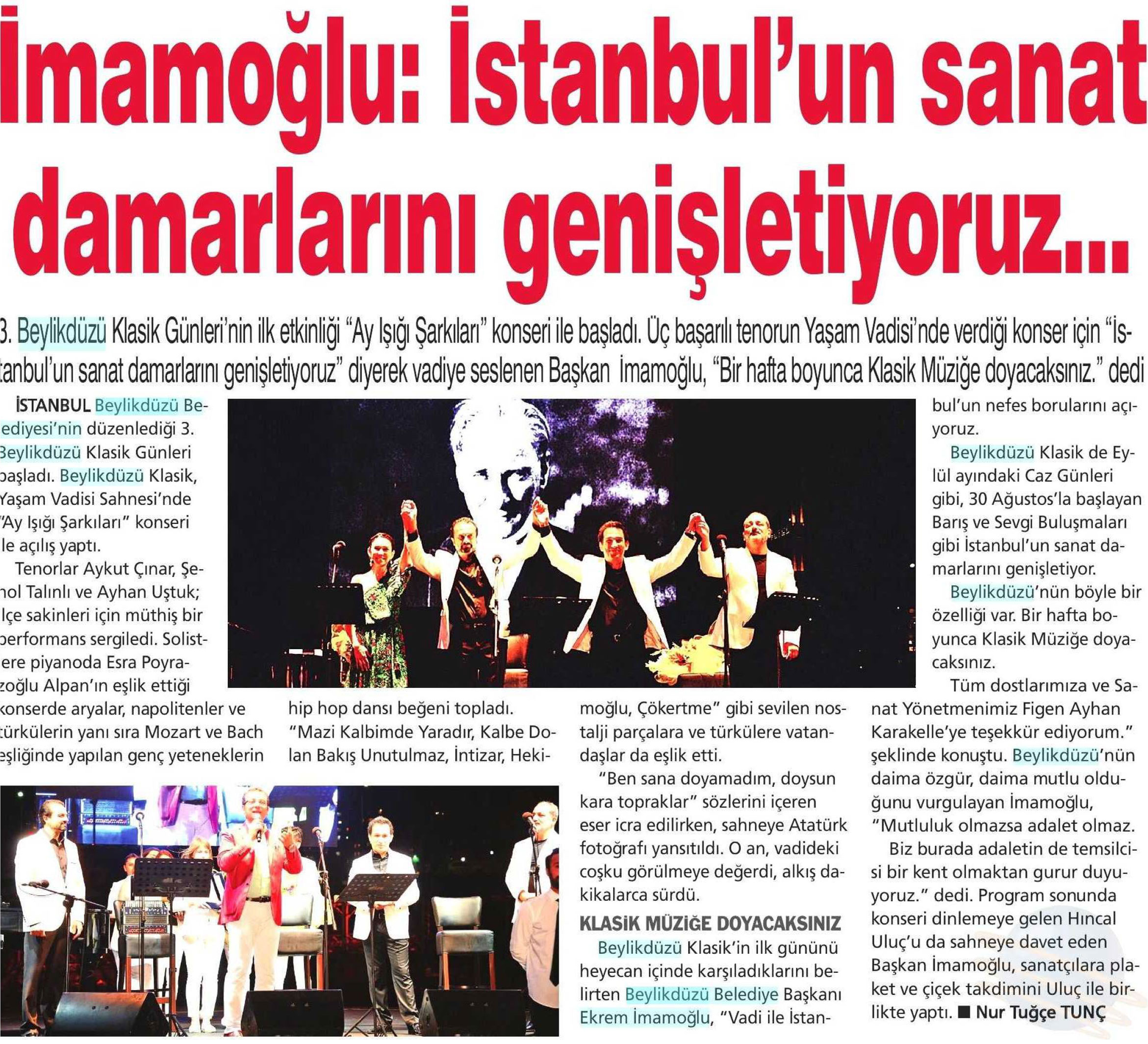 6 Temmuz 2017 tarihli "DOKUZ SÜTUN" gazetesi. Beylikdüzü Klasik Günleri'nin ilk etkinliği "Ay Işığı Şarkıları" konseri ile başladı. Başkan İmamoğlu,"bir hafta boyunca Klasik Müziğe doyacaksınız." dedi.