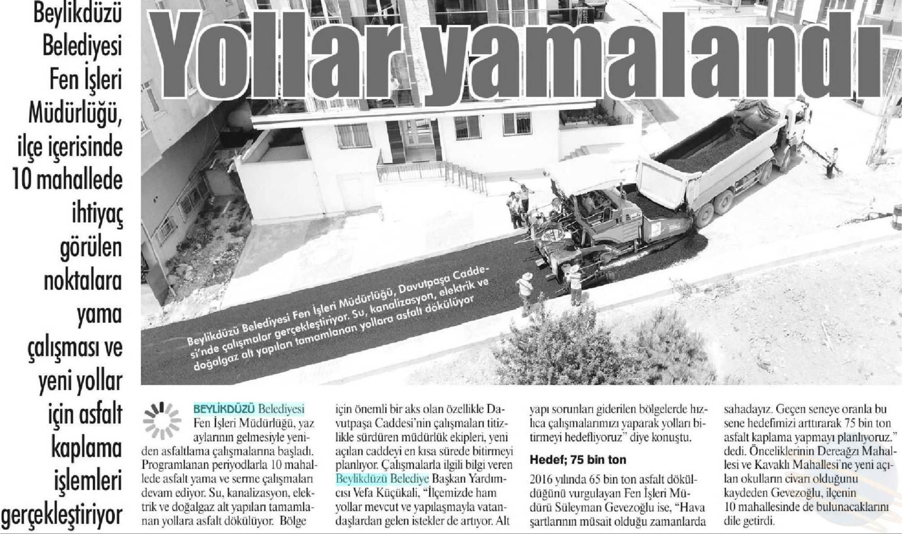 15 Haziran 2017 tarihli "GAZETEM İSTANBUL" gazetesi. Beylikdüzü Belediyesi Fen İşleri Müdürlüğü, Davutpaşa Caddesi'nde çalışmalar gerçekleştiriyor. Su,kanalizasyon,elektrik ve doğalgaz alt yapıları tamamlanan yollara asfalt dökülüyor.