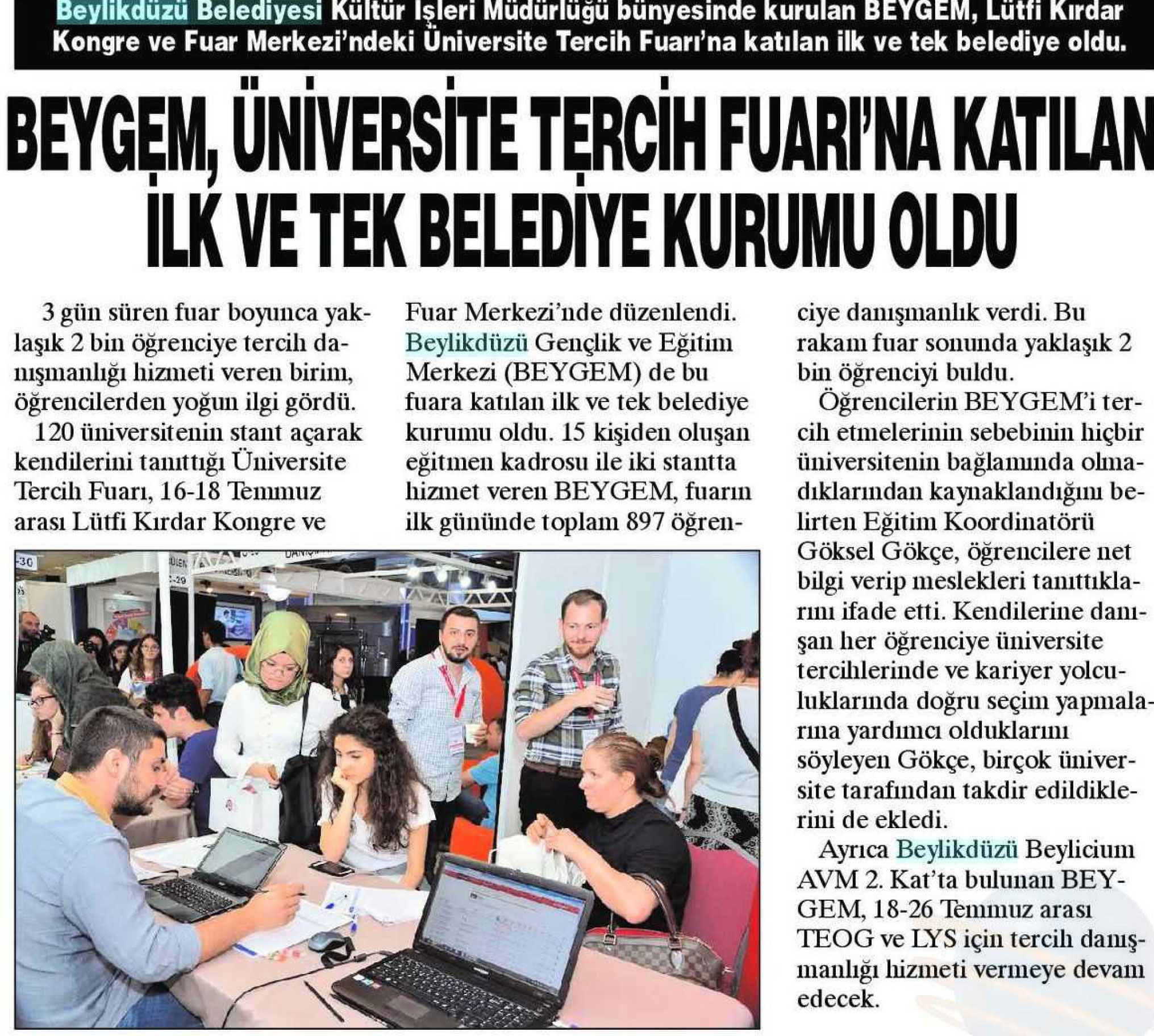 19 Temmuz 2017 tarihli "BÜYÜKÇEKMECE" gazetesi. Beylikdüzü Belediyesi Kültür İşleri Müdürlüğü bünyesinde kurulan BEYGEM, Lütfü Kırdar Kongre ve Fuar Merkezi'ndeki Üniversite Tercih Fuarı'na katılan ilk ve tek belediye oldu.