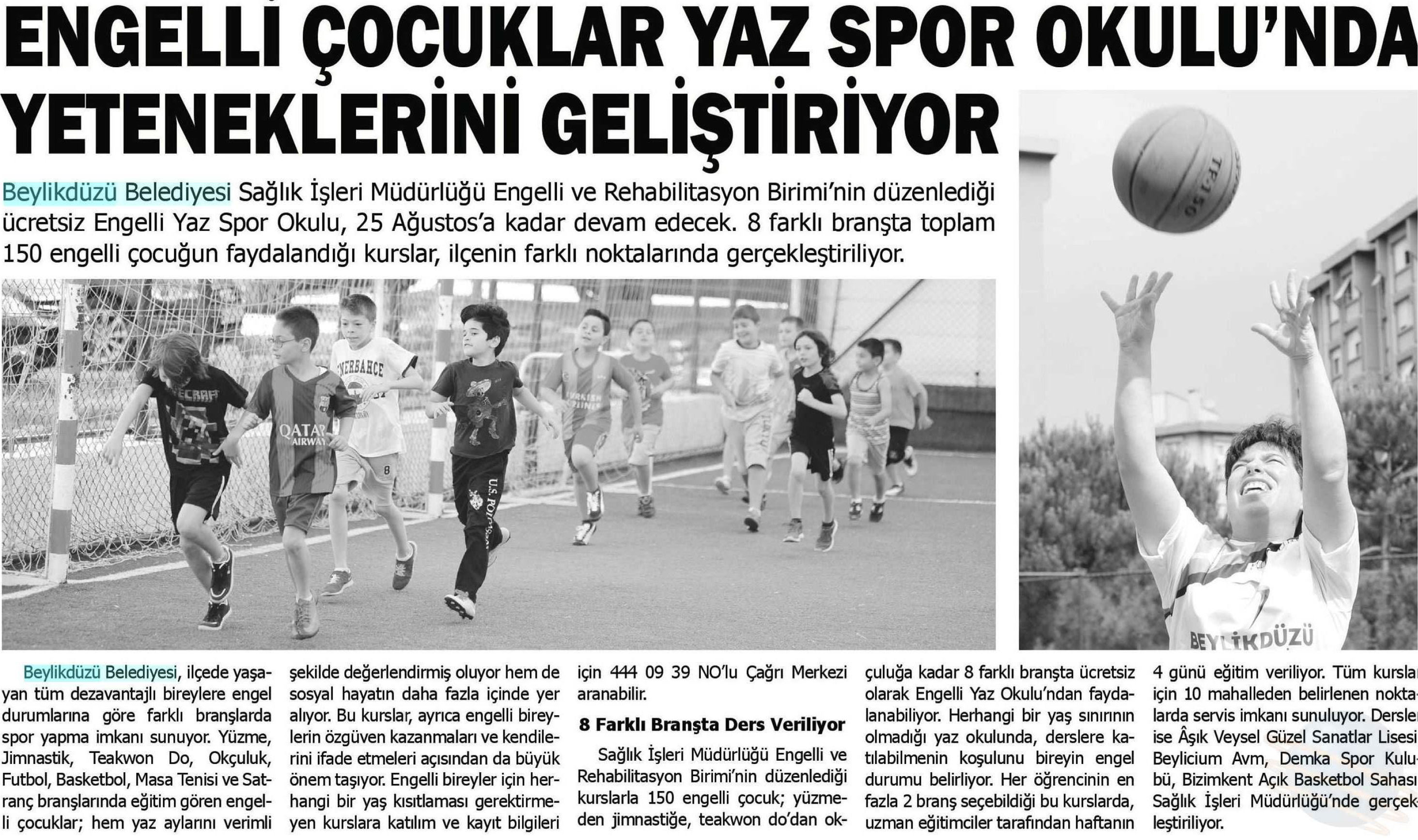 19 Temmuz 2017 tarihli "İÇ SES" gazetesi. Beylikdüzü Belediyesi Sağlık İşleri Müdürlüğü Engelli ve Rehabilitasyon Birimi'nin düzenlediği ücretsiz Engelli Yaz Spor Okulu 25 Ağustos'a kadar devam edecek.