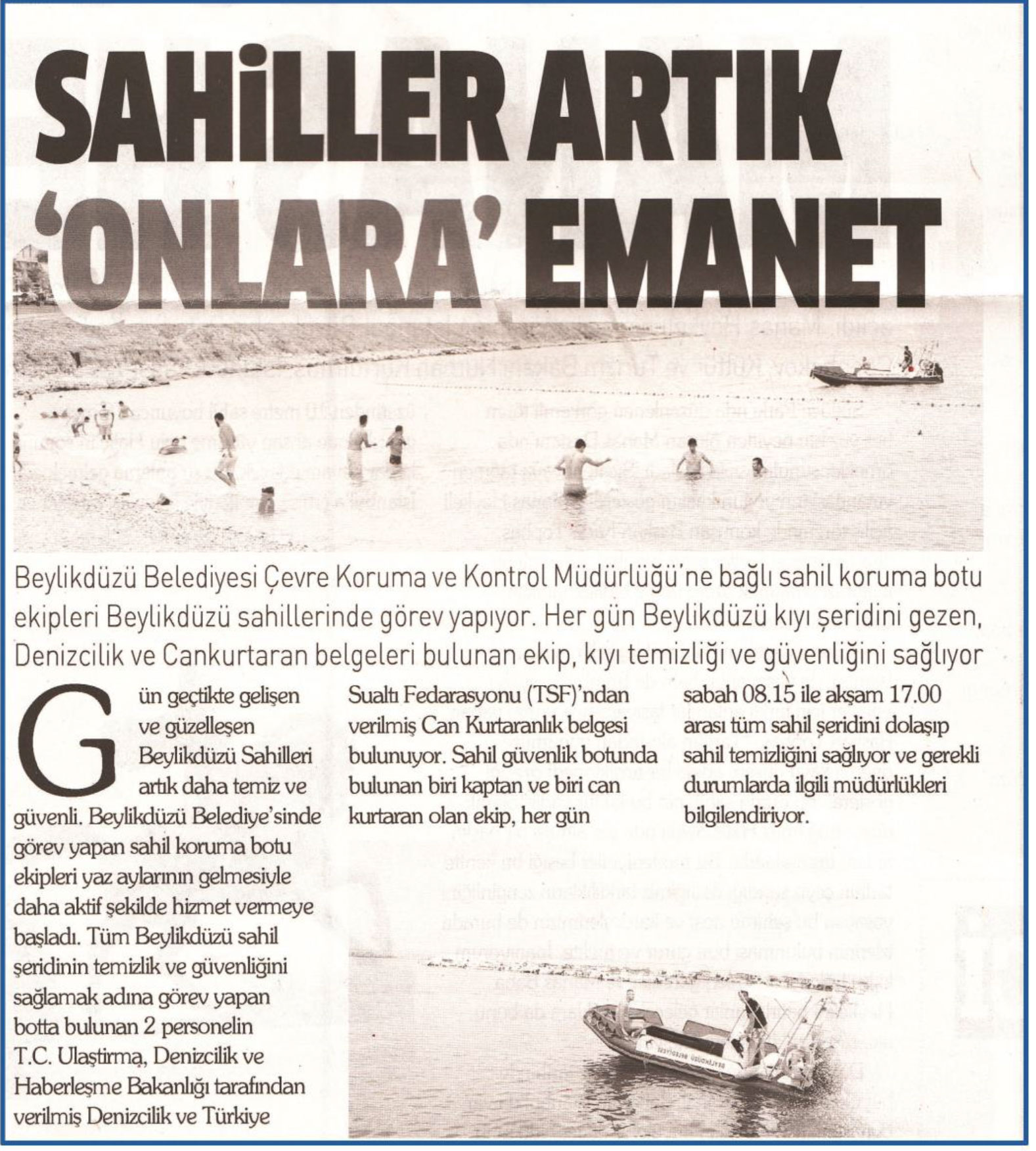 10 Ağustos 2017 tarihli "HABERCİ" gazetesi. Beylikdüzü Belediyesi Çevre Koruma ve Kontrol Müdürlüğü'ne bağlı sahil koruma botu ekipleri Beylikdüzü sahillerinde görev yapıyor. Her gün Beylikdüzü kıyı şeridini gezen,Denizcilik ve Cankurtaran belgeleri bulunan ekip, kıyı temizliği ve güvenliğini sağlıyor.