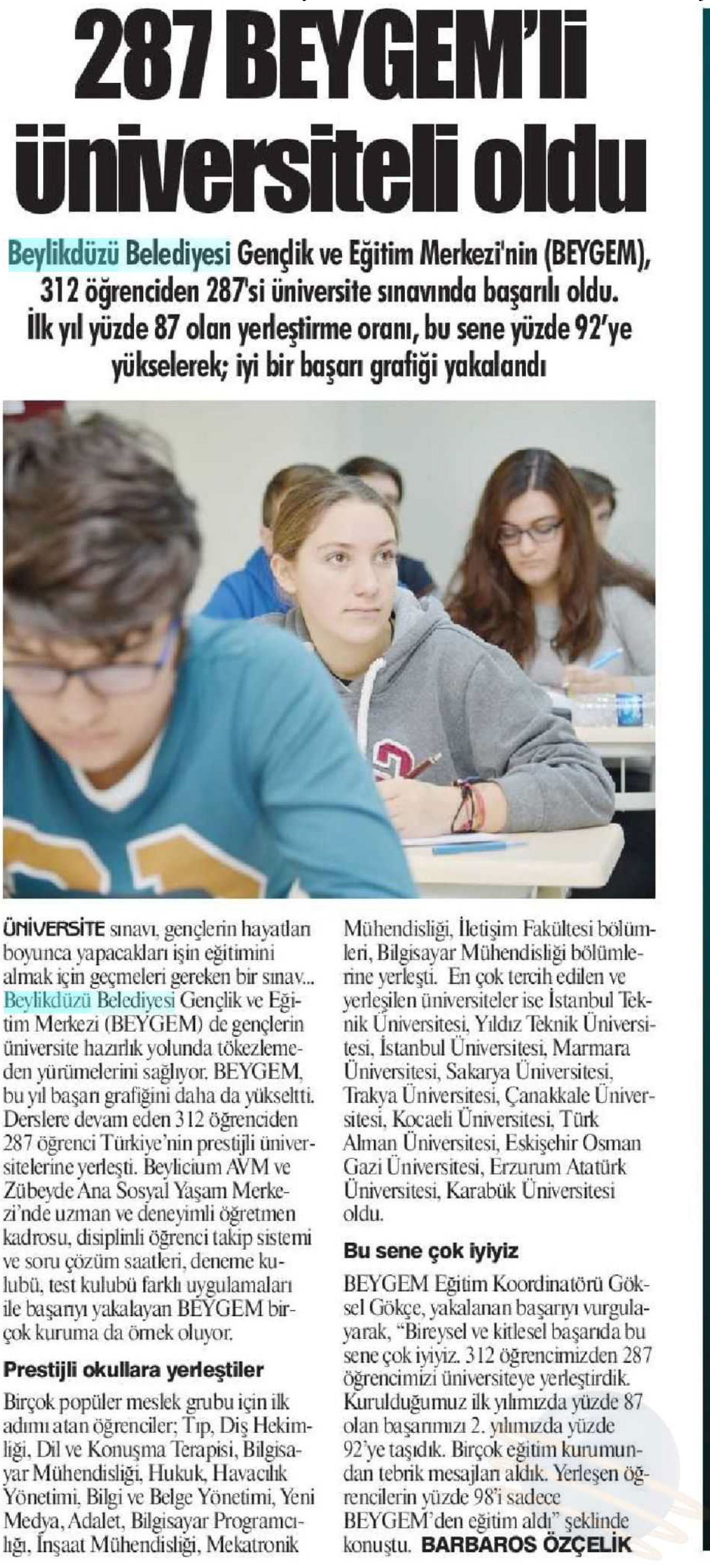 12 Ağustos 2017 tarihli "GAZETEM İSTANBUL" gazetesi. Beylikdüzü Belediyesi Gençlik ve Eğitim Merkezi'nin (BEYGEM), 312 öğrenciden 287'si üniversite sınavında başarılı oldu.