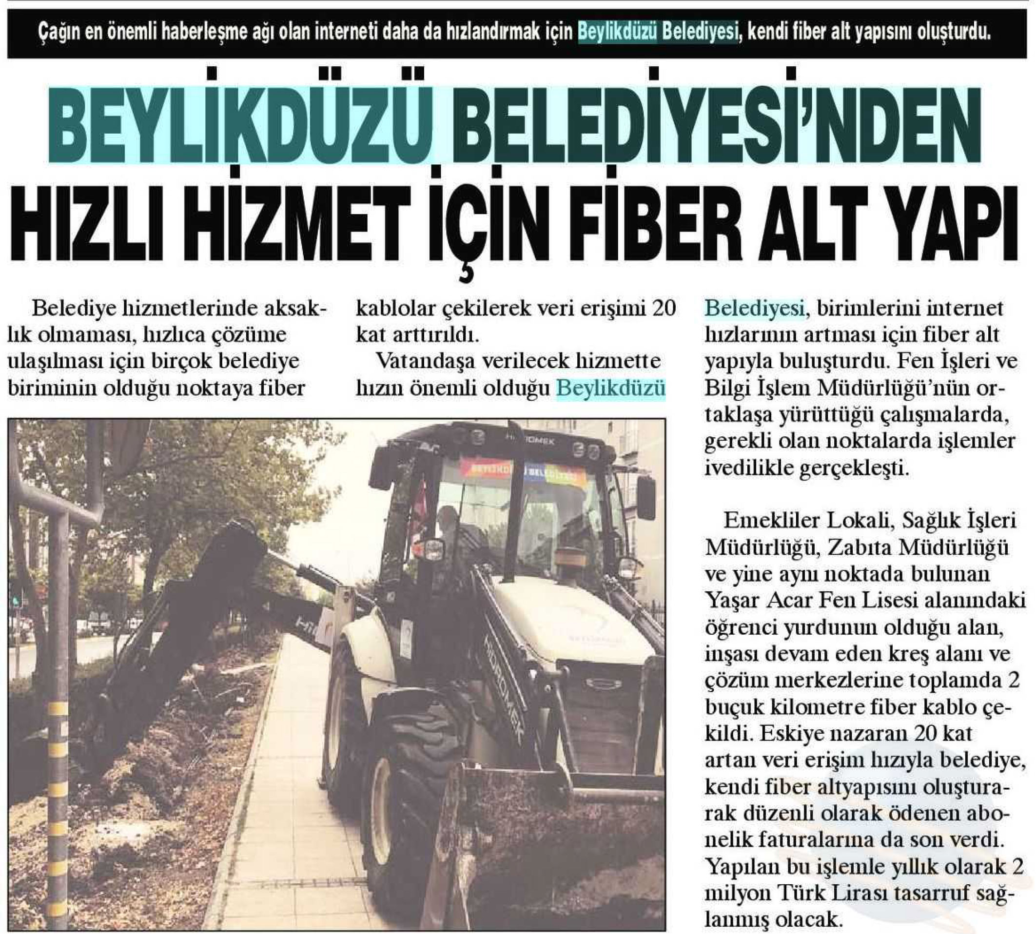16 Ağustos 2017 tarihli "BÜYÜKÇEKMECE" gazetesi. Çağın en önemli haberleşme ağı olan interneti daha da hızlandırmak için Beylikdüzü Belediyesi, kendi fiber alt yapısını oluşturdu. Fen İşleri ve Bilgi İşlem Müdürlüğü'nün ortaklaşa yürüttüğü çalışmalarda, gerekli olan noktalarda işlemler ivedilikle gerçekleştirildi.