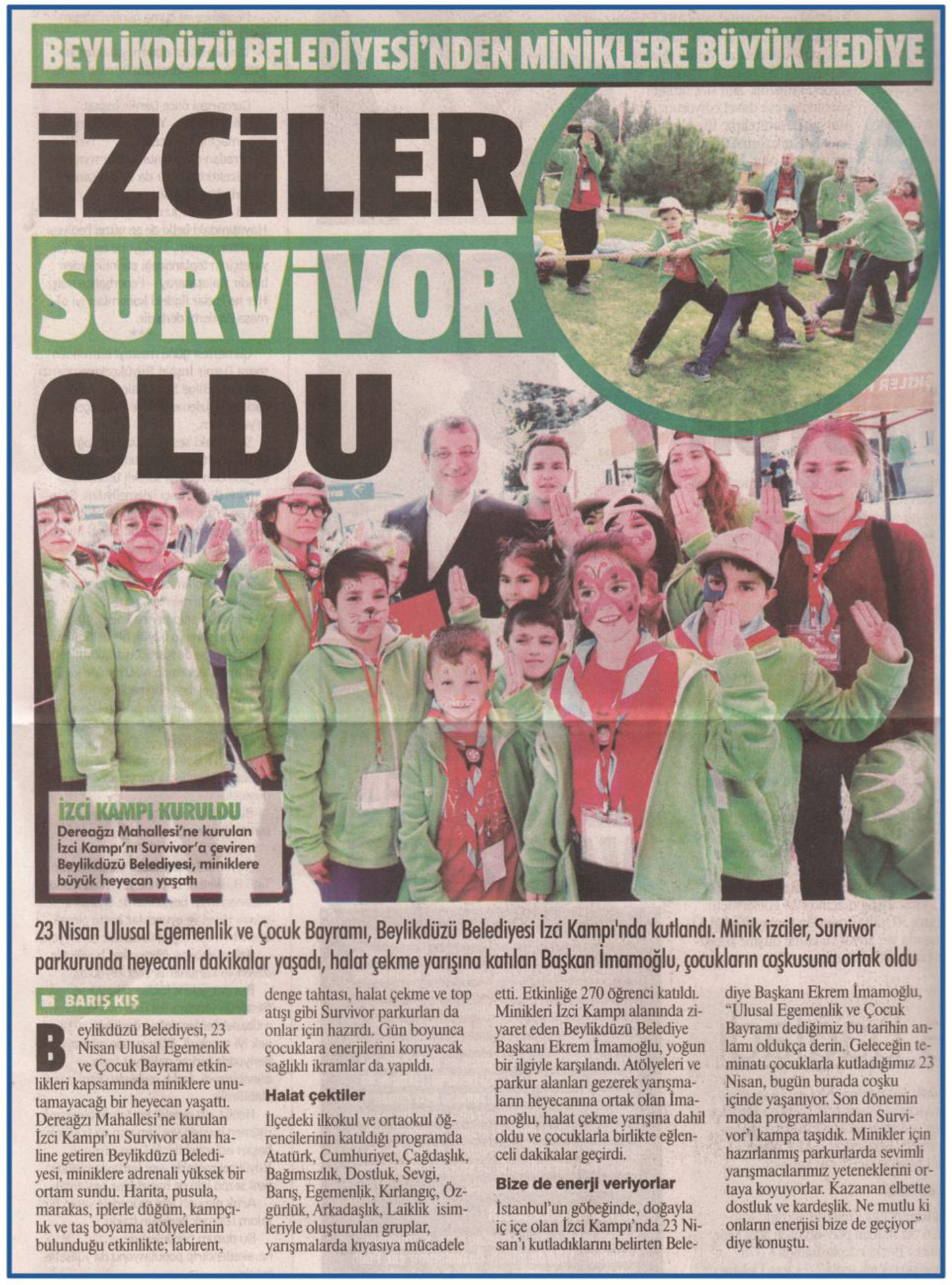24 Nisan 2017 tarihli "GAZETEM İSTANBUL" gazetesi. 23 Nisan Ulusal Egemenlik ve Çocuk Bayramı, Beylikdüzü Belediyesi İzci Kampı'nda kutlandı. Minik izciler, Survivor parkında heyecanlı dakikalar yaşadı, halat çekme yarışına katılan Başkan İmamoğlu, çocukların çoşkusuna ortak oldu.
