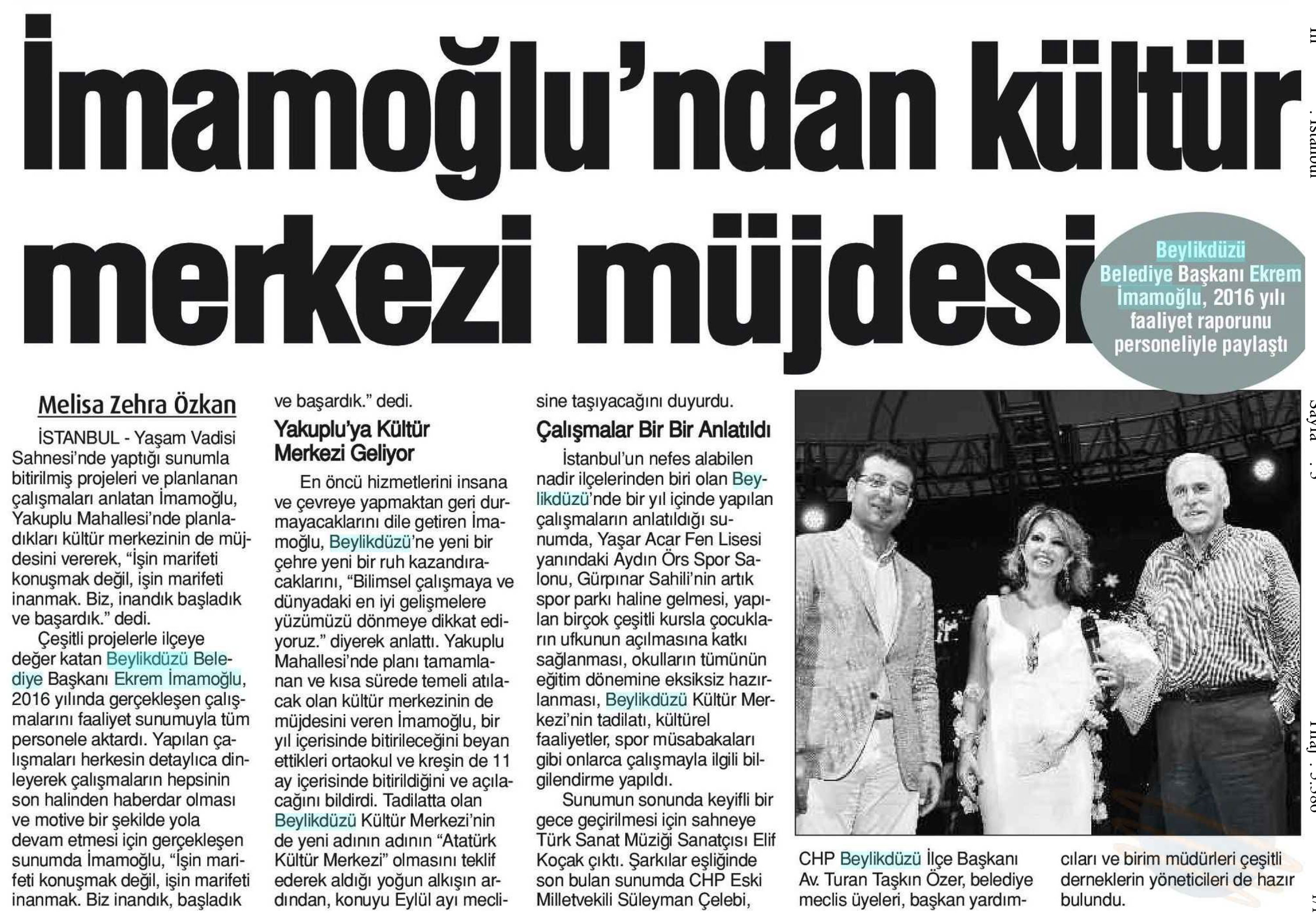 20 Ağustos 2017 tarihli "YENİ ÇAĞRI" gazetesi. Beylikdüzü Belediye Başkanı Ekrem İmamoğlu, 2016 yılında gerçekleşen çalışmalarını faaliyet sunumuyla tüm personele aktardı. Yaşam Vadisi Sahnesi'nde yaptığı sunumla Yakuplu Mahallesi'nde planladıkları kültür merkezinin'de müjdesini verdi.