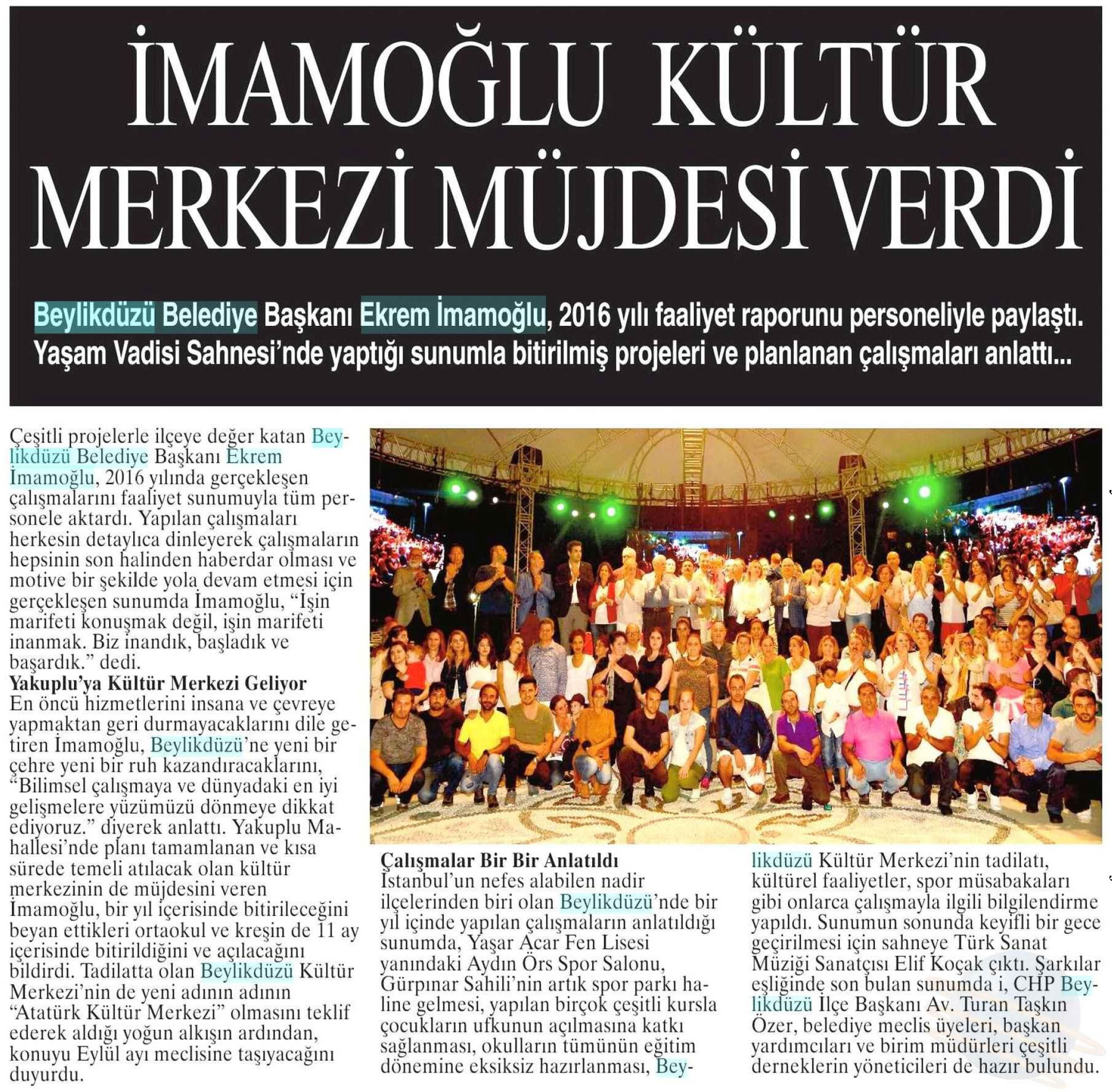 22 Ağustos 2017 tarihli "NABIZ" gazetesi. Beylikdüzü Belediye Başkanı Ekrem İmamoğlu, 2016 yılı faaliyet raporunu personeliyle paylaştı. Yaşam Vadisi Sahnesi'nde yaptığı sunumla bitirilmiş projeleri ve planlanan çalışmaları anlattı.