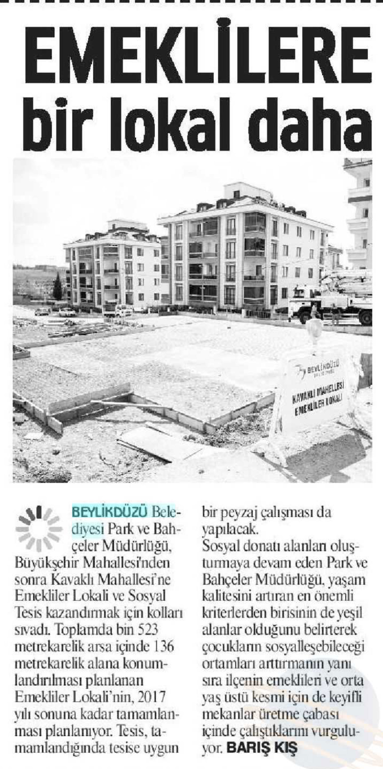 25 Ağustos 2017 tarihli "GAZETEM İSTANBUL"gazetesi. Beylikdüzü Belediyesi Park ve Bahçeler Müdürlüğü, Büyükşehir Mahallesi'nden sonra Kavaklı Mahallesi'ne Emekliler Lokali ve Sosyal Tesis kazandırmak için kolları sıvadı.