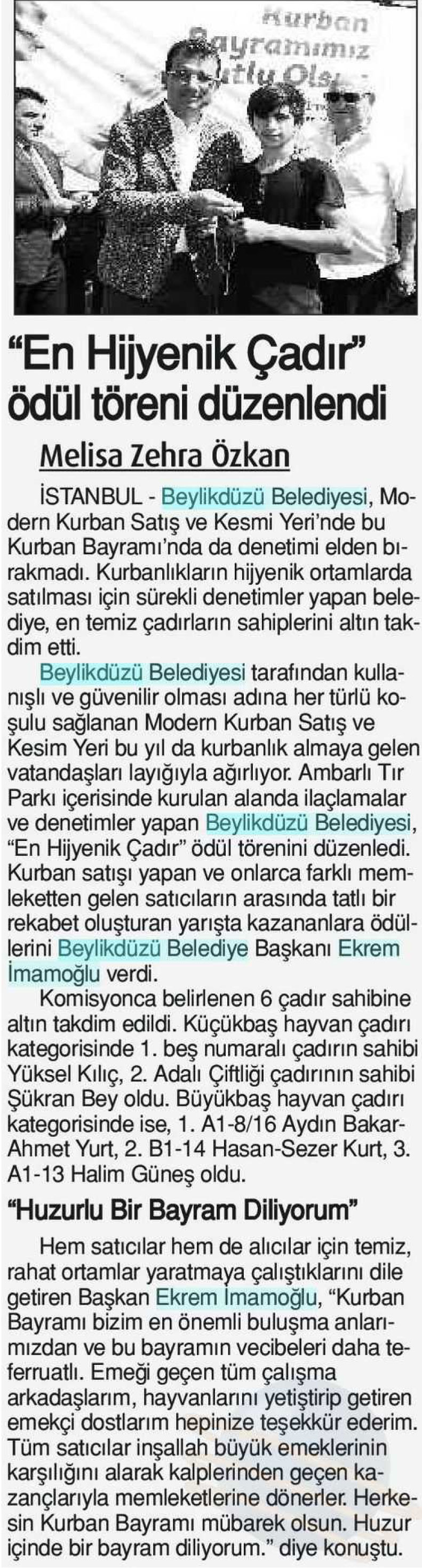 1 Eylül 2017 tarihli "YENİ ÇAĞRI" gazetesi. Beylikdüzü Belediyesi tarafından kullanışlı ve güvenilir olması adına her türlü koşulu sağlayan Modern Kurban Satış ve Kesim Yeri bu yıl da kurbanlık almaya gelen vatandaşları layığıyla ağırlıyor. Beylikdüzü Belediyesi "En Hijyenik Çadır" ödül töreni düzenledi.Yarışta kazananlara ödüllerini Beylikdüzü Belediye Başkanı Ekrem İmamoğlu verdi.