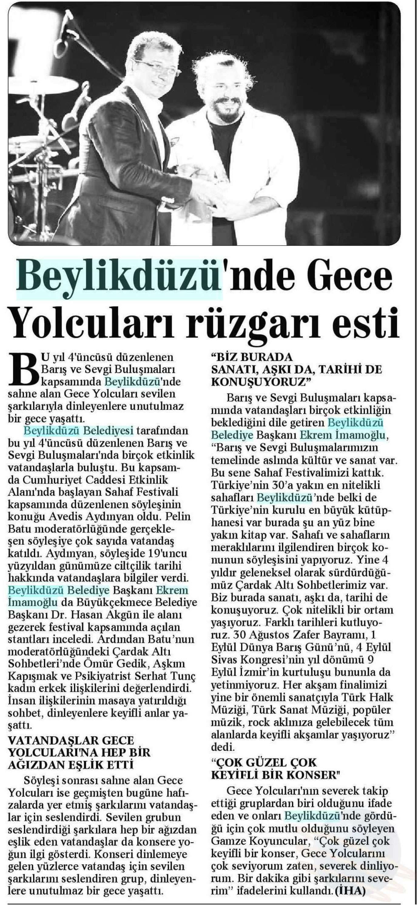 7 Eylül 2017 tarihli "GÜÇLÜ ANADOLU" gazetesi. Gece Yolcuları, Beylikdüzü Barış ve Sevgi Buluşmaları'nda sahne aldı. Cumhuriyet Caddesi Etkinlik Alanı'ndaki müzikseverleri etkisi altına alan grup şarkılarını çoşkuyla söyledi. Beylikdüzü Belediye Başkanı Ekrem İmamoğlu ise konuşmasının ardından gruba plaket ve çiçek takdiminde bulundu.