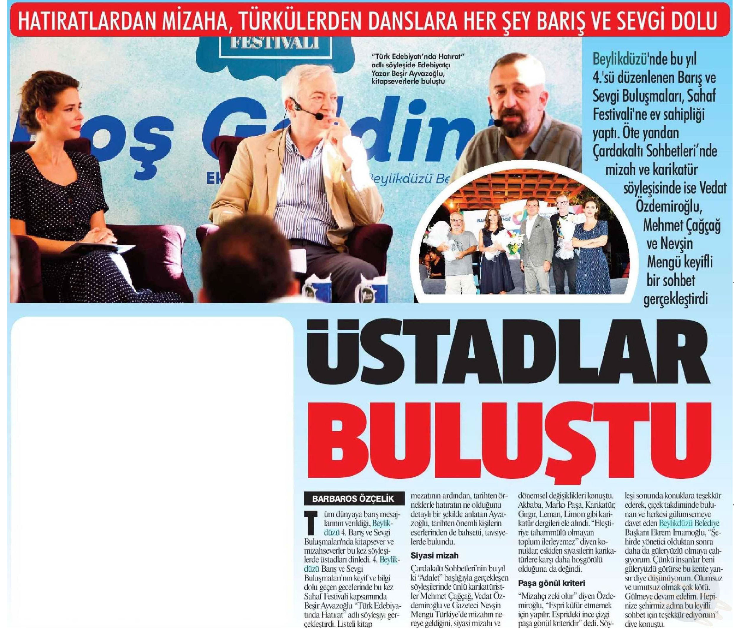 5 Eylül 2017 tarihli "GAZETEM İSTANBUL" gazetesi. Beylikdüzü'nde bu yıl 4.'sü düzenlenen Barış ve Sevgi Buluşmaları, Sahaf Festivali'ne ev sahipliği yaptı." Türk Edebiyatı'nda Hatırat" adlı söyleşide Edebiyatçı Yazar Beşir Ayvazoğlu, kitapseverlerle buluştu. Çardak Altı Sohbetleri'nde mizah ve karikatür söyleşisinde ise Vedat Özdemiroğlu,Mehmet Çağçağ ve Nevşin Mengü keyifli bir sohbet gerçekleştirdi.
