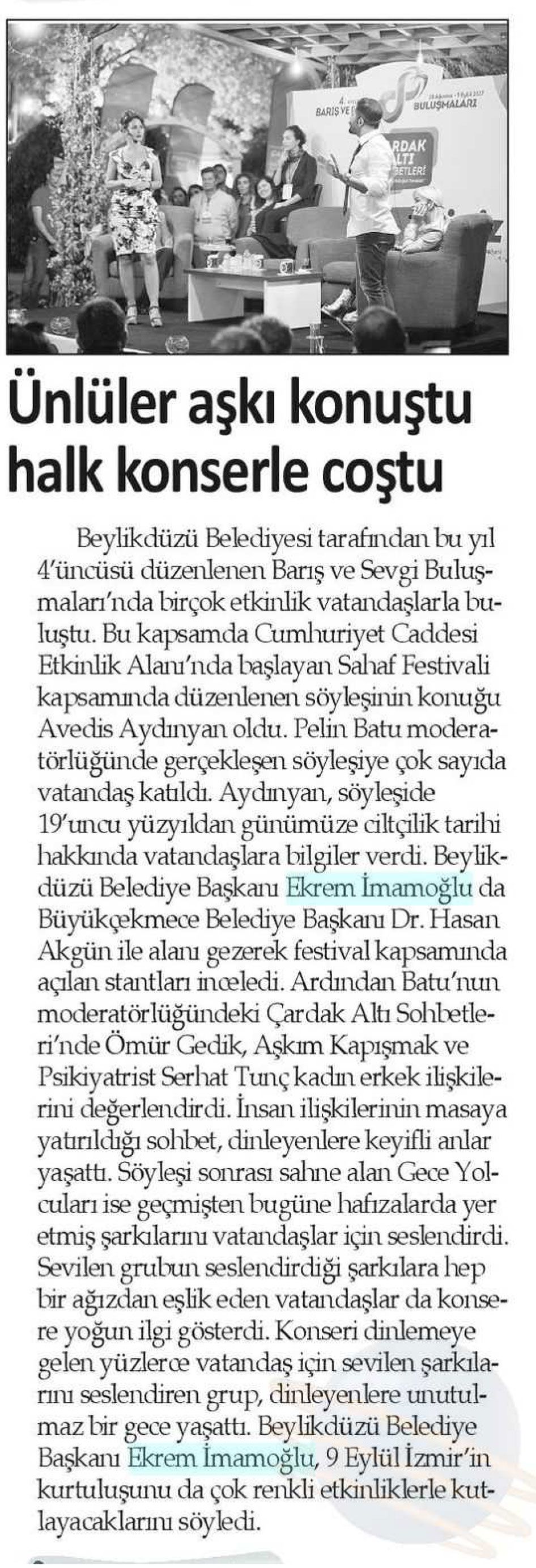 7 Eylül 2017 tarihli " İSTANBUL" gazetesi. Beylikdüzü Belediyesi tarafından bu yıl 4'üncüsü düzenlenen Barış ve Sevgi Buluşmaları'nda birçok etkinlik vatandaşlarla buluştu. Pelin Batu moderatörlüğündeki Çardak Altı Sohbetleri'nde Ömür Gedik,Aşkım Kapışmak,ve Psikiyatrist Serhat Tunç kadın erkek ilişkilerini değerlendirdi.