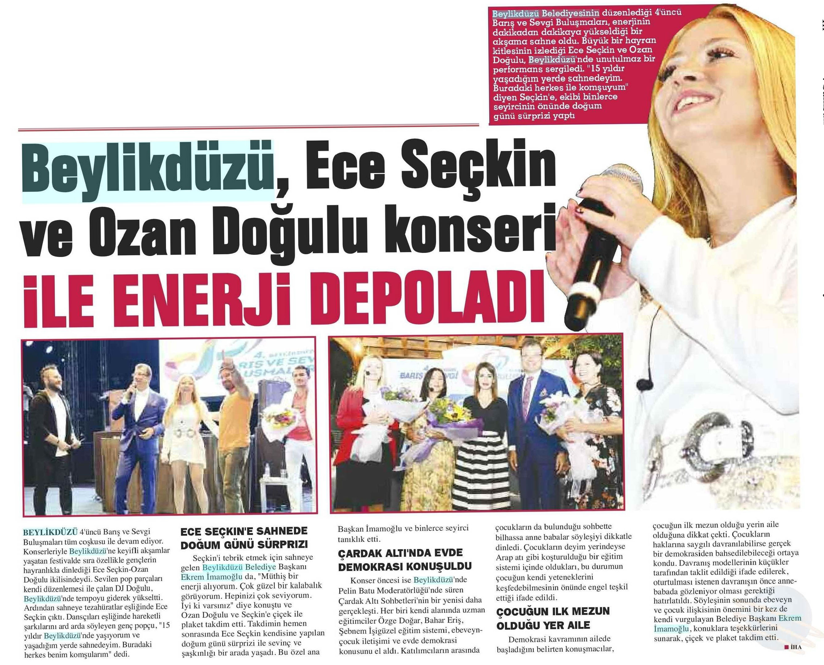 8 Eylül 2017 tarihli "ARENA" gazetesi. Beylikdüzü Belediyesinin düzenlediği 4'üncü Sevgi ve Barış Buluşmaları, enerjinin yükseldiği bir akşama sahne oldu. Ece Seçkin ve Ozan Doğulu Beylikdüzü'nde unutulmaz bir performans sergiledi. Konser Öncesi Pelin Batu Moderatörlüğü'nde süren Çardak Altı Sohbetler'inde ise her biri kendi alanında uzman eğitimciler, Özge Doğar,Bahar Eriş, Şebnem İşigüzel eğitim sistemi,evde demokrasi konusunu ele aldı.