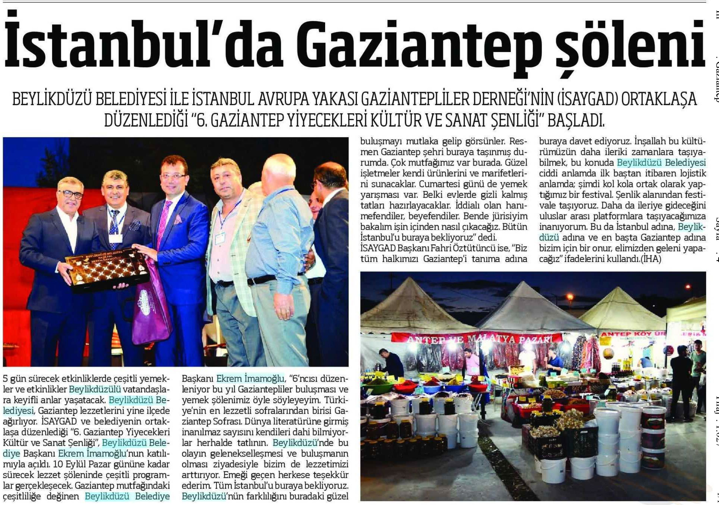 8 Eylül 2017 tarihli "TELGRAF" gazetesi. Beylikdüzü Belediyesi ile İstanbul Avrupa Yakası Gaziantepliler Derneği'nin ortaklaşa düzenlediği "6. Gaziantep Yiyecekleri Kültür ve Sanat Şenliği" Başladı.