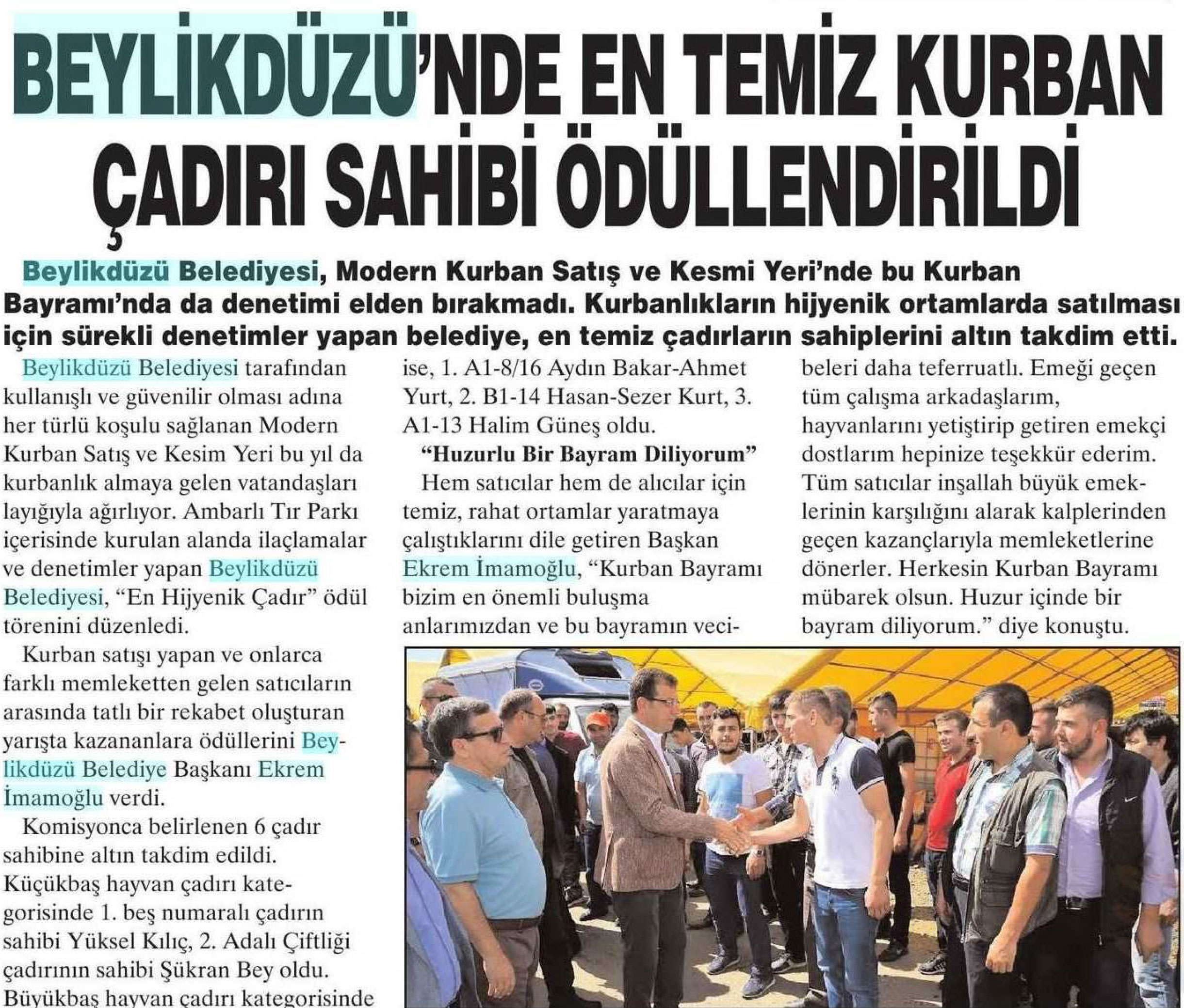 10 Eylül 2017 tarihli "YURT HABER" gazetesi. Beylikdüzü Belediyesi, Modern Kurban Satış ve Kesmi Yeri'nde bu Kurban Bayramı'nda da denetimi elden bırakmadı. Kurbanlıkların hijyenik ortamlarda satılması için sürekli denetimler yapan belediye, en temiz çadırların sahiplerine altın takdim etti.