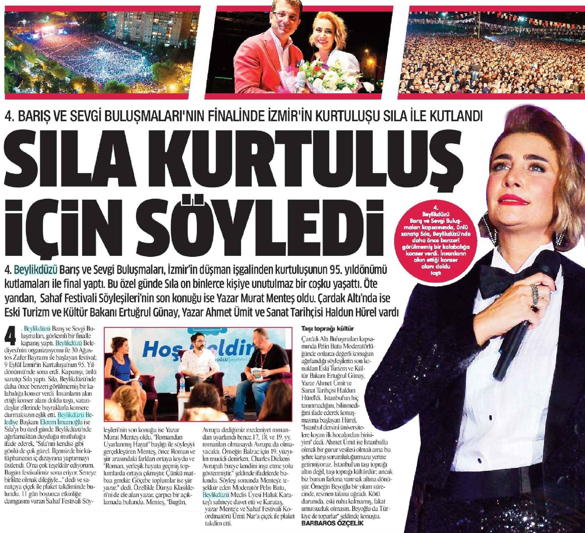 11 Eylül 2017 tarihli "GAZETEM İSTANBUL" 4. Beylikdüzü Barış ve Sevgi Buluşmaları, İzmir'in düşman işgalinden kurtuluşunun 95. yıldönümü kutlamaları ile final yaptı. Sahaf Festivali Söyleşilerinin son konuğu ise Yazar Murat Menteş oldu. Çardak Altı'nda ise Eski Turizm ve Kültür Bakanı Ertuğrul Günay, Yazar Ahmet Ümit ve Sanat Tarihçisi Haldun Hürel vardı.