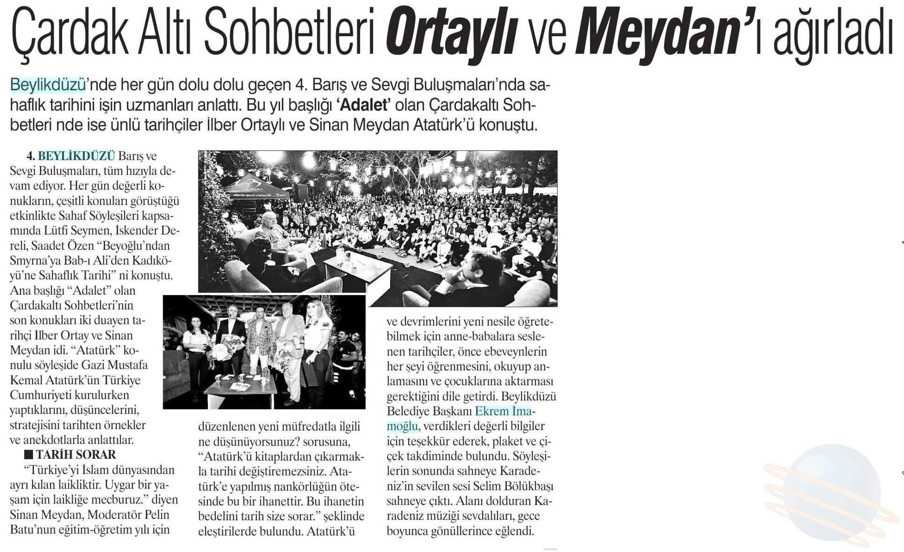 12 Eylül 2017 tarihli "DOKUZ SÜTUN" gazetesi. Beylikdüzü'nde her gün dolu dolu geçen 4. Barış ve Sevgi Buluşmaları'nda sahaflık tarihini işin uzmanı anlattı. Bu yıl başlığı Adalet olan Çardak Altı Sohbetleri'nde ise ünlü tarihçiler İlber Ortaylı ve Sinan Meydan Atatürk'ü konuştu.