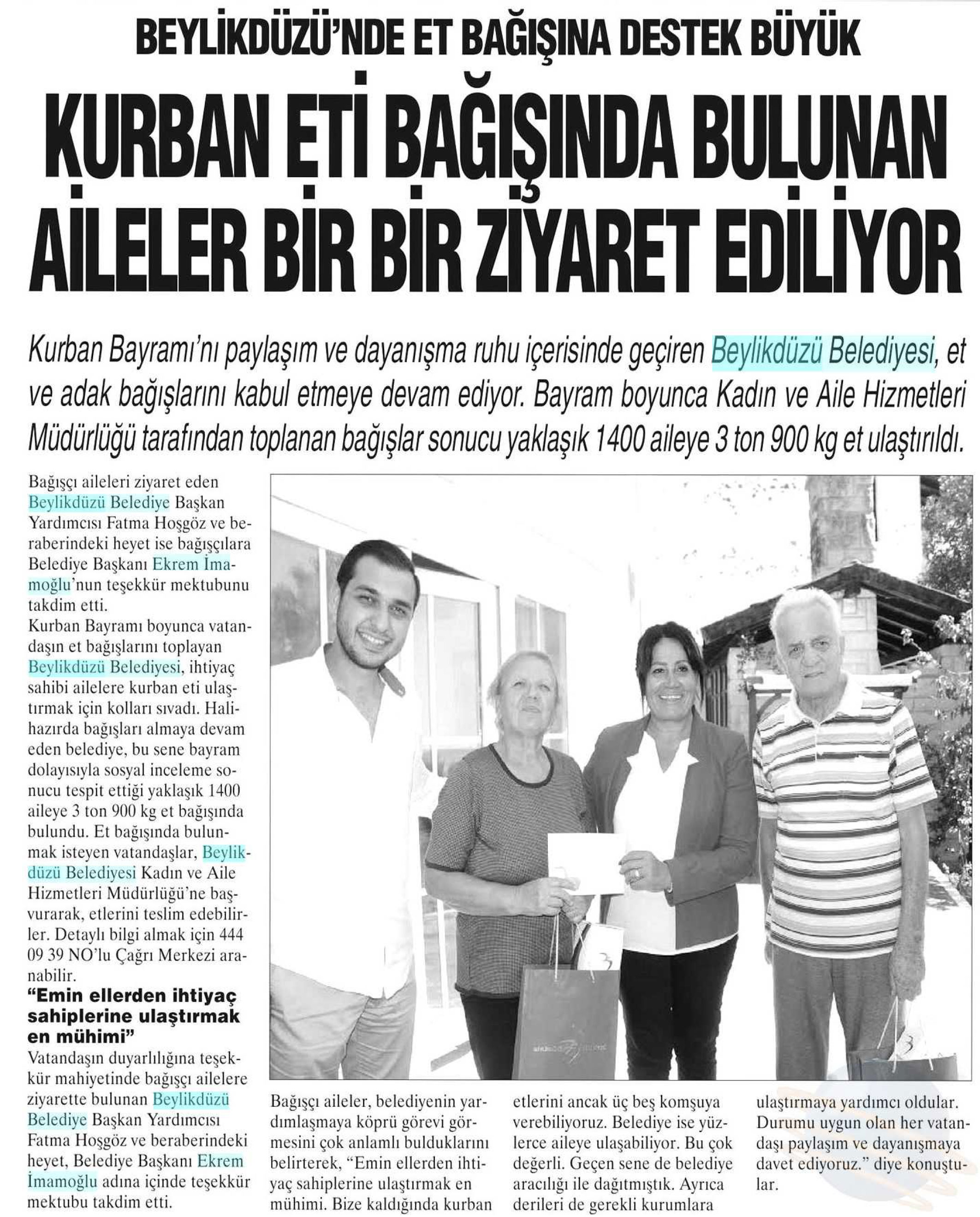 13 Eylül 2017 tarihli "BÜYÜKÇEKMECE" gazetesi. Kurban Bayramı'nı paylaşım ve dayanışma ruhu içerisinde geçiren Beylikdüzü Belediyesi, et ve adak bağışlarını kabul etmeye devam ediyor. Bayram boyunca Kadın ve Aile Hizmetleri Müdürlüğü tarafından toplanan bağışlar sonucu yaklaşık 1400 aileye 3 ton 900 kg et ulaştırıldı.