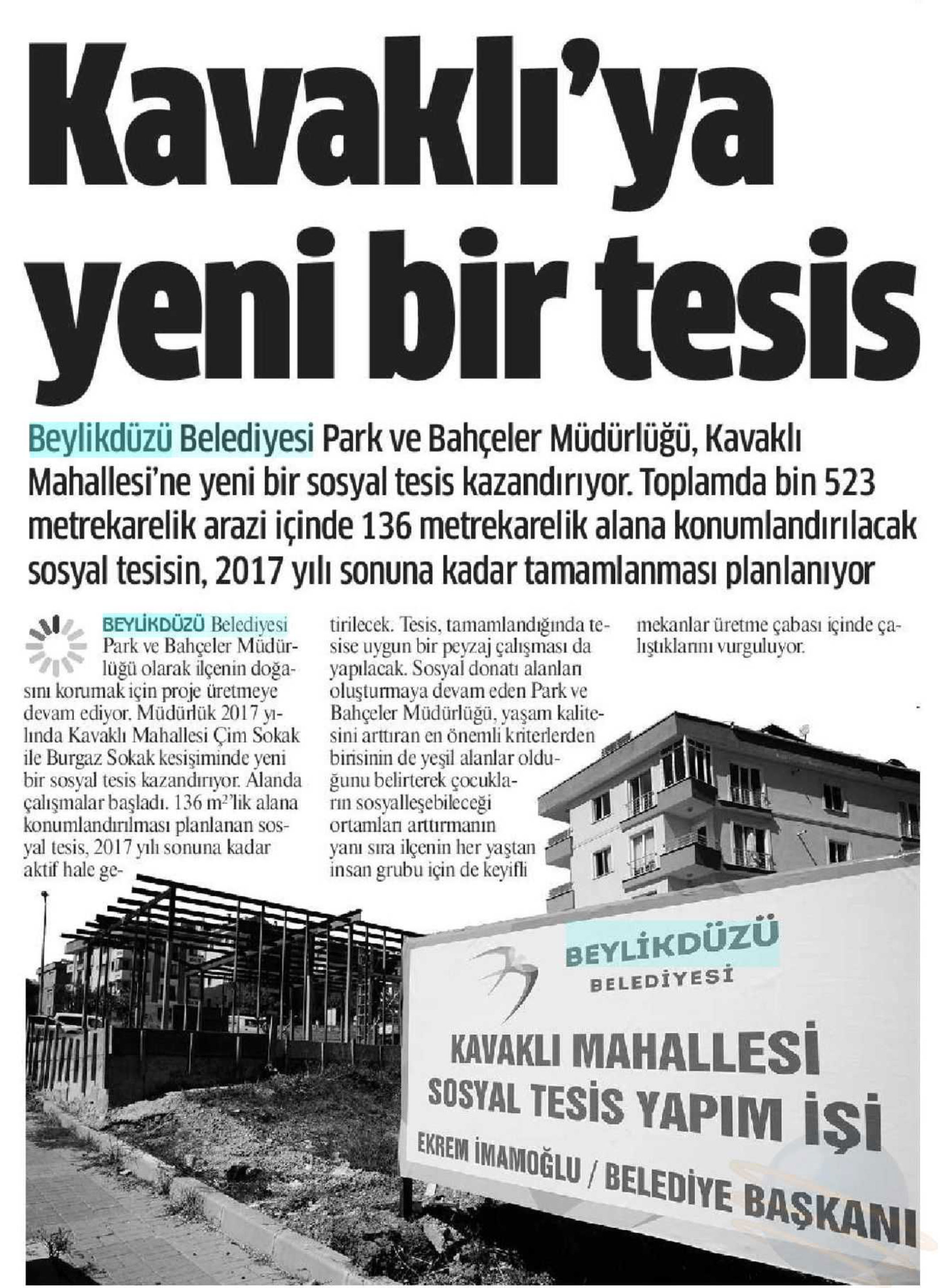 14 Eylül 2017 tarihli "GAZETEM İSTANBUL" Beylikdüzü Belediyesi Park ve Bahçeler Müdürlüğü, Kavaklı Mahallesi'ne yeni bir sosyal tesis kazandırıyor.