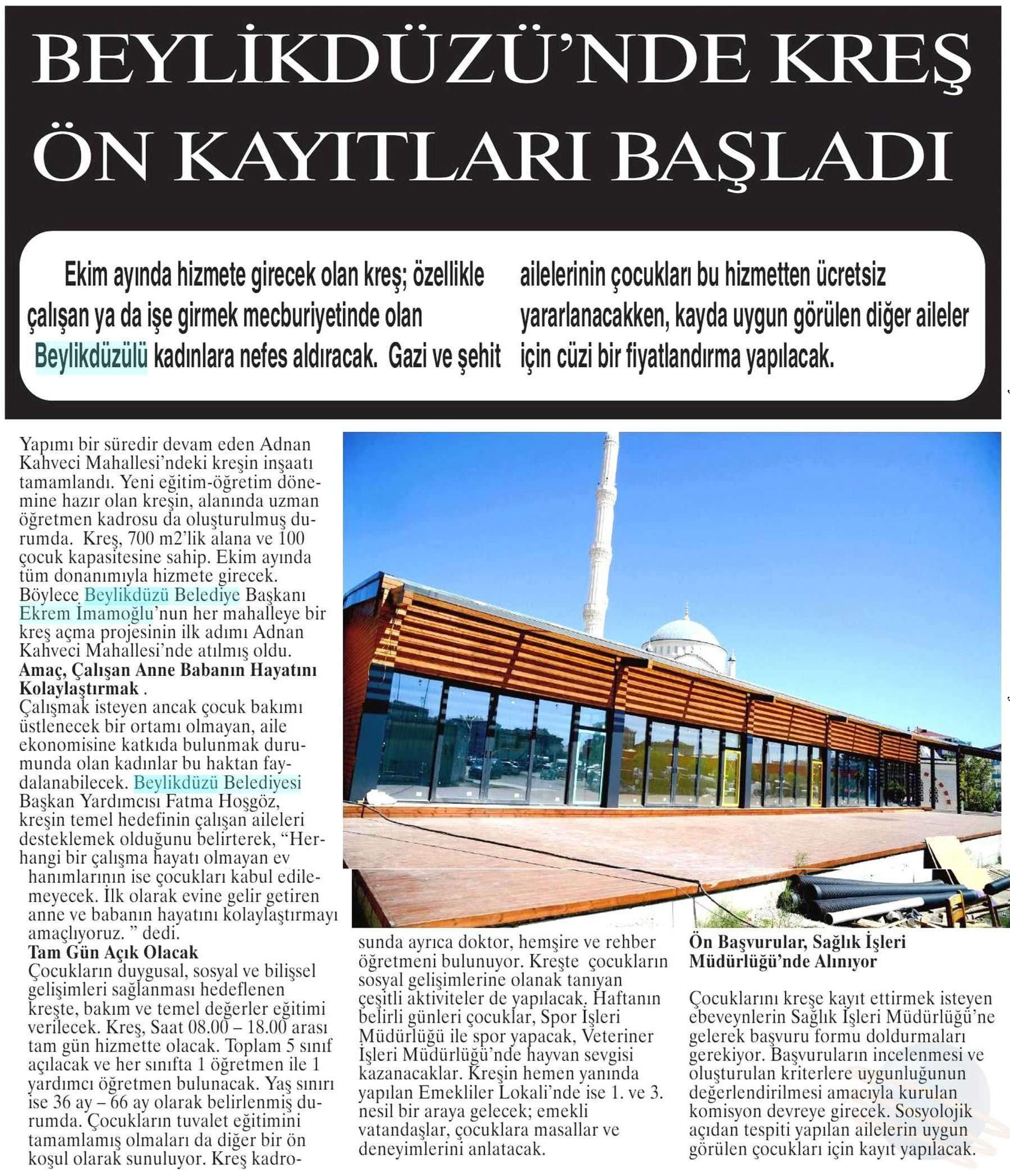 15 Eylül 2017 tarihli "NABIZ" gazetesi. Beylikdüzü Belediye Başkanı Ekrem İmamoğlu'nun her mahalleye bir kreş açma projesinin ilk adımı Adnan Kahveci Mahallesi'nde atılmış oldu. Amaç, Çalışan Anne Babanın Hayatını Kolaylaştırmak.