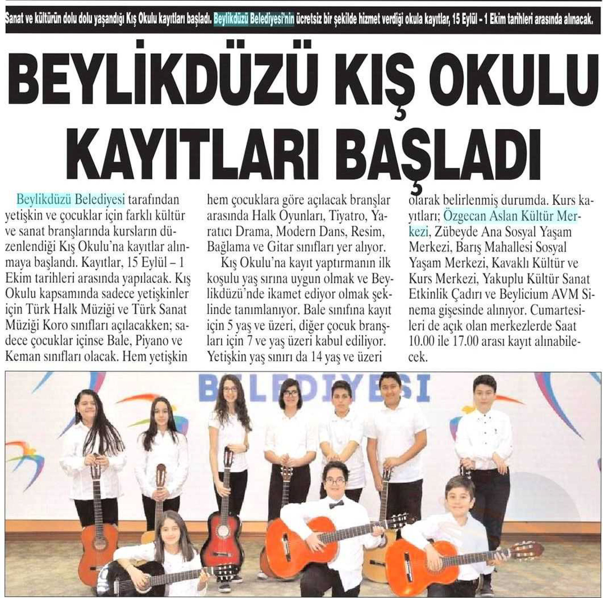 18 Eylül 2017 tarihli "BÜYÜKÇEKMECE" gazetesi. Sanat ve kültürün dolu dolu yaşandığı Kış Okulu kayıtları başladı. Beylikdüzü Belediyesi'nin ücretsiz bir şeklide hizmet verdiği okula kayıtlar, 15 Eylül- 1 Ekim tarihleri arasında alınacak.