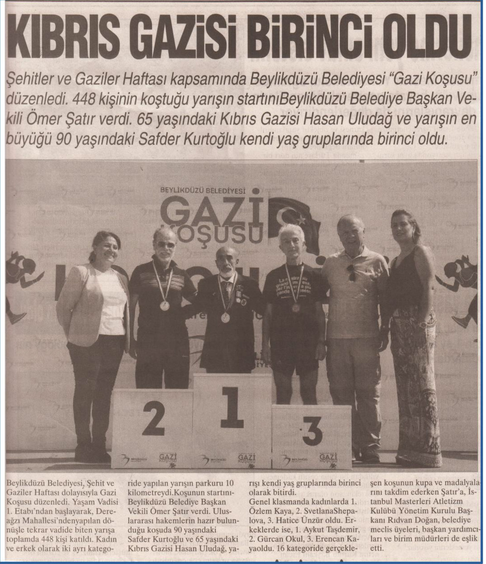 19 Eylül 2017 tarihli "BÜYÜKÇEKMECE" gazetesi. Şehitler ve Gaziler Hatası kapsamında Beylikdüzü Belediyesi "Gazi Koşusu" düzenlendi. 448 kişinin koştuğu yarışın startını Beylikdüzü Belediye Başkan Vekili Ömer Şatır verdi. 65 yaşındaki Kıbrıs Gazisi Hasan Uludağ ve yarışın en büyüğü 90 yaşındaki Safder Kurtoğlu kendi yaş gruplarında birinci oldu.