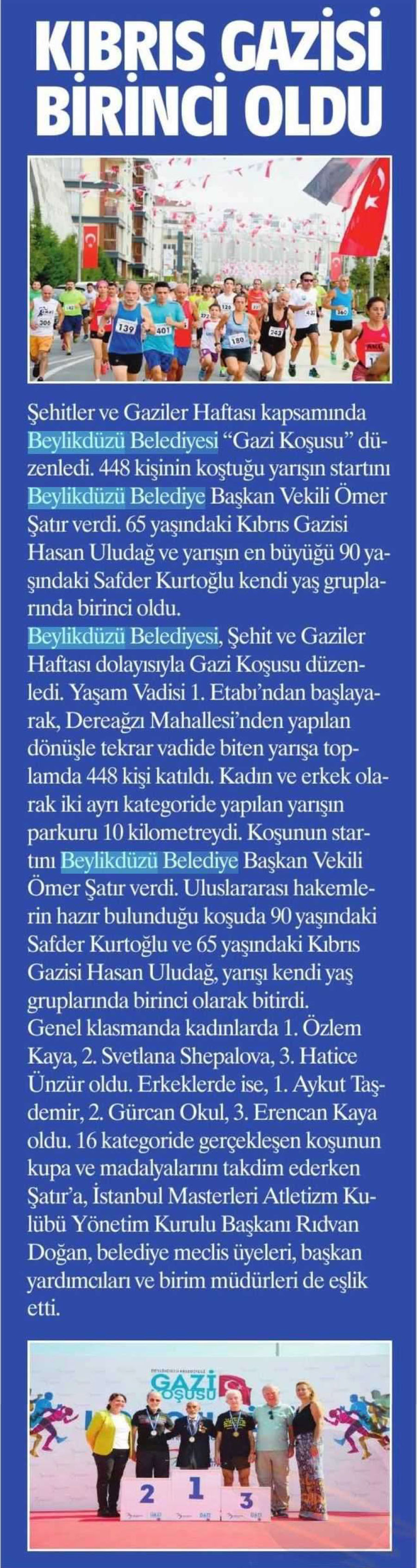 21 Eylül 2017 tarihli "ZEYNA" gazetesi. Beylikdüzü Belediyesi, Şehit ve Gaziler Haftası dolasıyla Gazi Koşusu düzenledi. 65 yaşındaki Kıbrıs Gazisi Hasan Uludağ ve yarışın en büyüğü 90 yaşındaki Safder Kurtoğlu kendi yaş gruplarında birinci oldu.