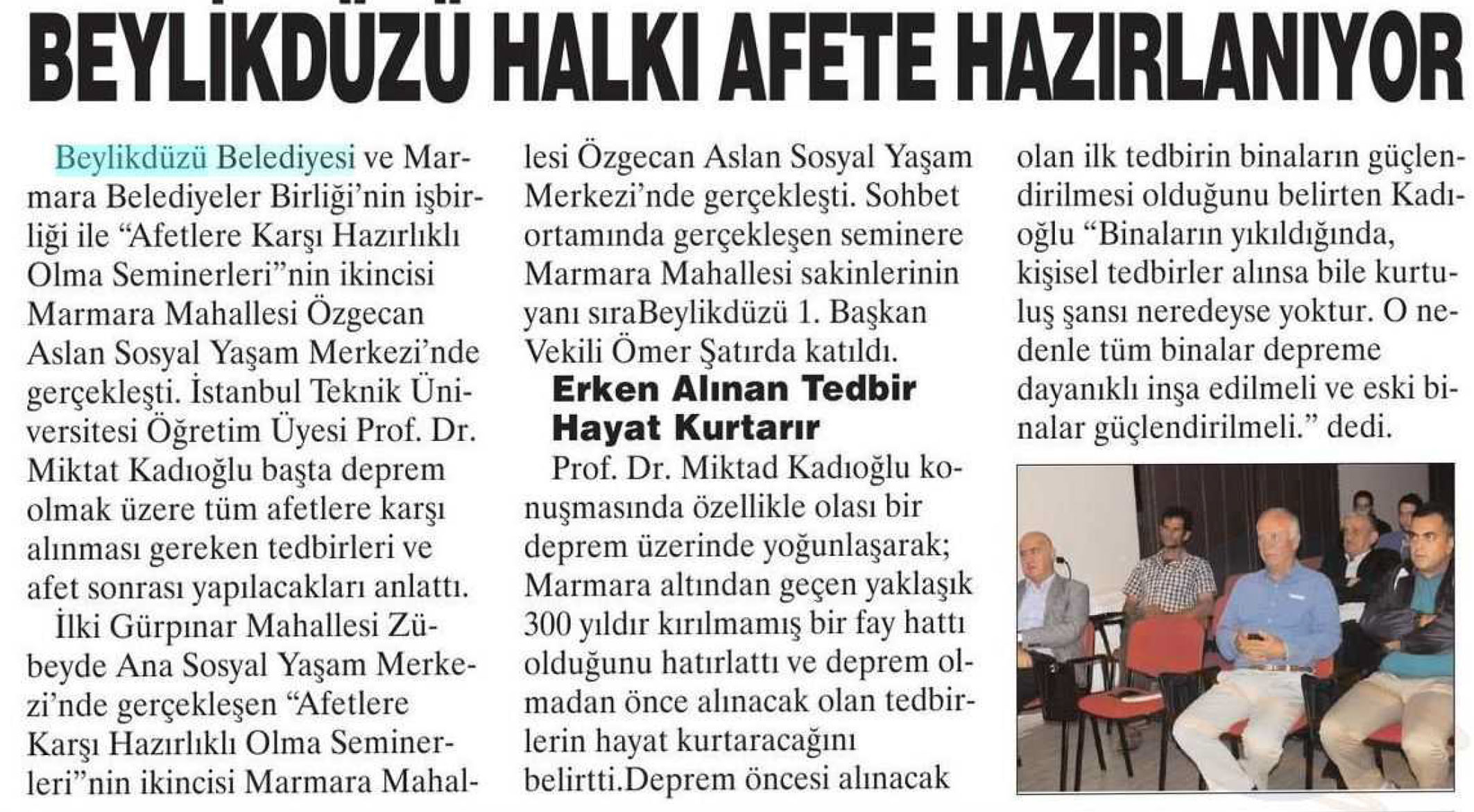 25 Eylül 2017 tarihli "BÜYÜKÇEKMECE" gazetesi. Beylikdüzü Belediyesi ve Marmara Belediyeler Birliği'nin işbirliği ile "Afetlere Karşı Hazırlıklı Olma Seminerleri" 'nin ikincisi Marmara Mahallesi Özgecan Aslan Sosyal Yaşam Merkezi'nde gerçekleşti.