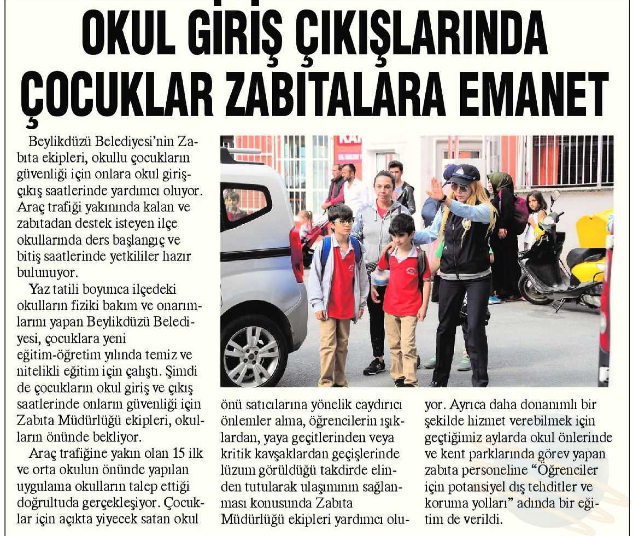 27 Eylül 2017 tarihli "BÜYÜKÇEKMECE" gazetesi. Beylikdüzü Belediyesi'nin Zabıta ekipleri,okullu çocukların güvenliği için onlara okul giriş çıkış saatlerinde yardımcı oluyor.