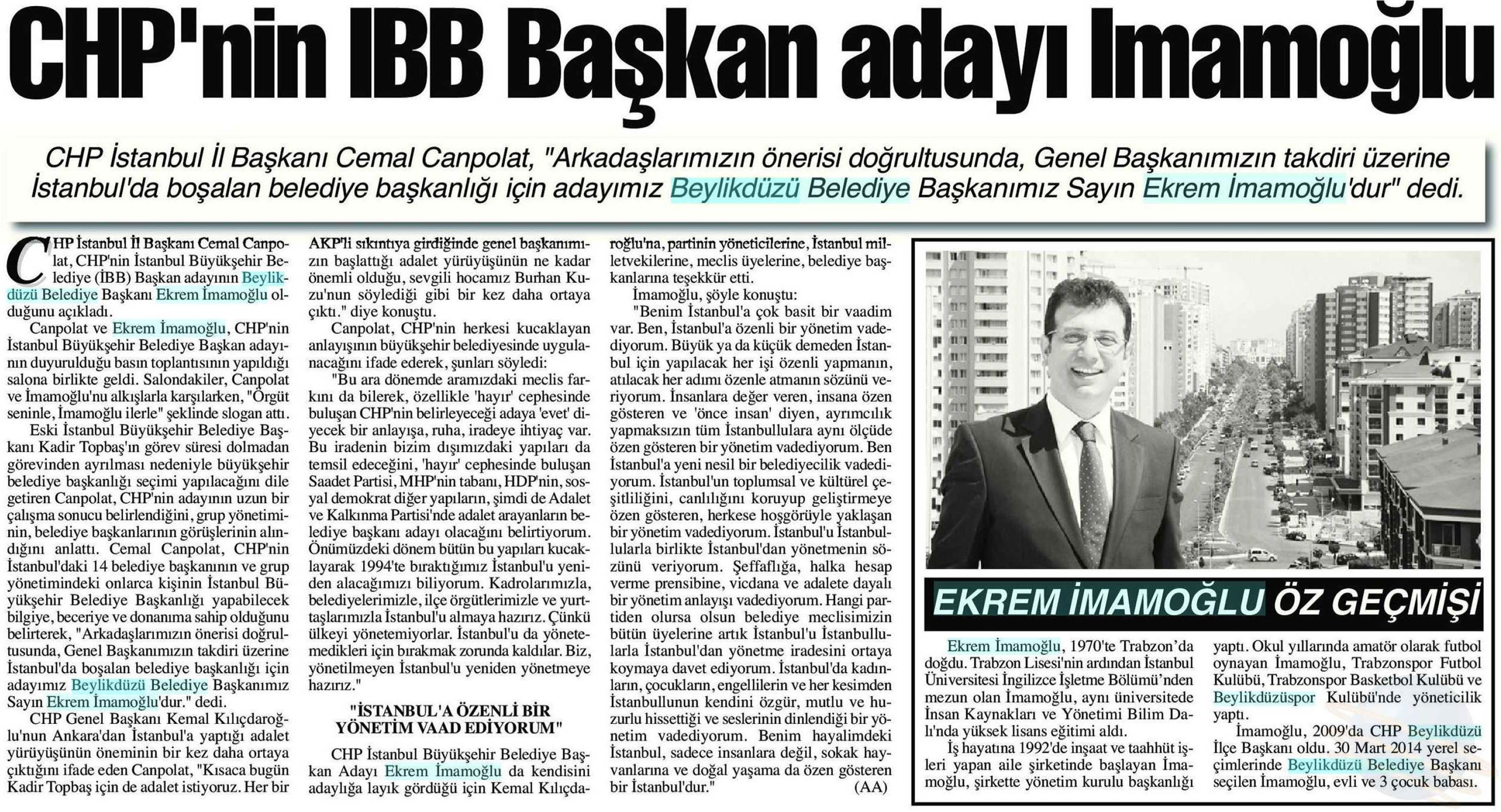 28 Eylül 2017 tarihli "BAŞKENT" gazetesi. CHP İl Başkanı Cemal Canpolat,"Arkadaşlarımızın önerisi doğrultusunda, Genel Başkanımızın takdiri üzerine İstanbul'da boşalan belediye başkanlığı için adayımız Beylikdüzü Belediye Başkanımız Ekrem İmamoğlu'dur" dedi.