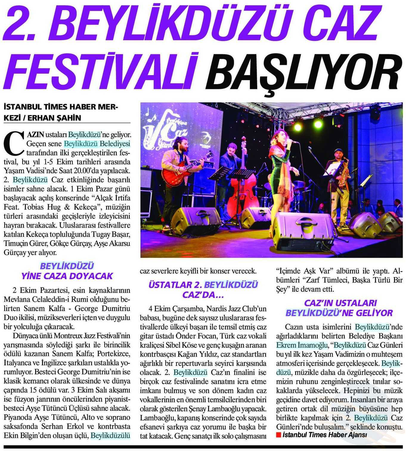 1 Ekim 2017 tarihli "İSTANBUL TIMES" gazetesi. Cazın ustaları Beylikdüzü'ne geliyor. Geçen sene Beylikdüzü Belediyesi tarafından ilki gerçekleştirilen festival, bu yıl 1-5 Ekim tarihleri arasında Yaşam Vadisi'nde Saat 20.00'de yapılacak.