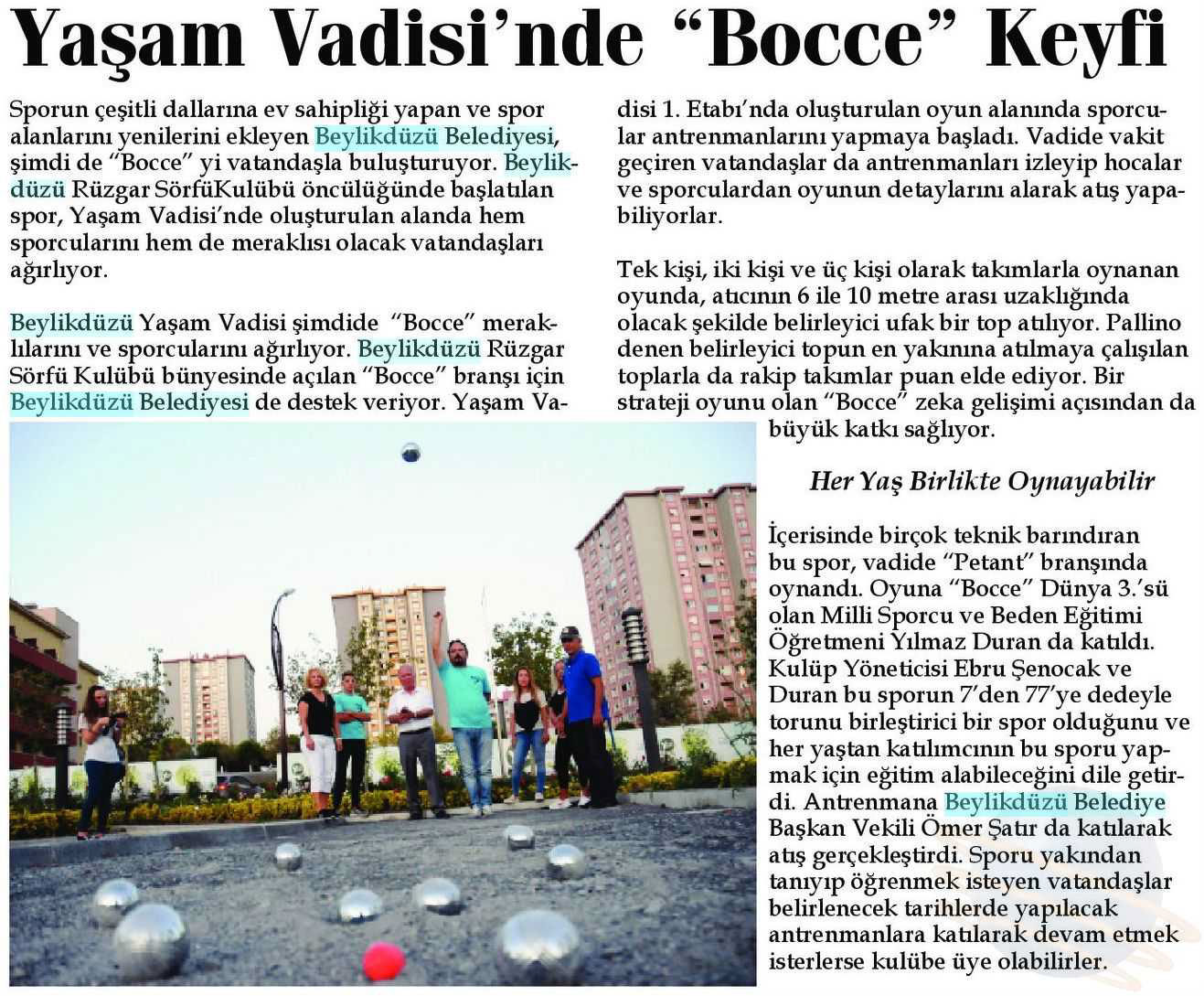3 Ekim 2017 tarihli "BEYLİKDÜZÜ" gazetesi. Beylikdüzü Belediyesi, şimdi de "Bocce" yi vatandaşla buluşturuyor.Beylikdüzü Rüzgar Sörfü Kulübü öncülüğünde başlatılan spor,Yaşam Vadisi'nde oluşturulan alanda hem sporcularını hem de meraklısı olacak vatandaşları ağırlıyor.