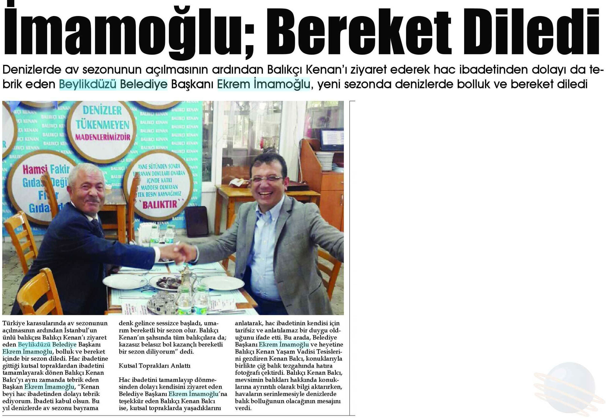 3 Ekim 2017 tarihli "Beylikdüzü" gazetesi. Denizlerde av sezonunun açılmasının ardından Balıkçı Kenan'ı ziyaret ederek hac ibadetinden dolayı da tebrik eden Beylikdüzü Belediye Başkanı Ekrem İmamoğlu, yeni sezonda denizlerde bolluk ve bereket diledi.
