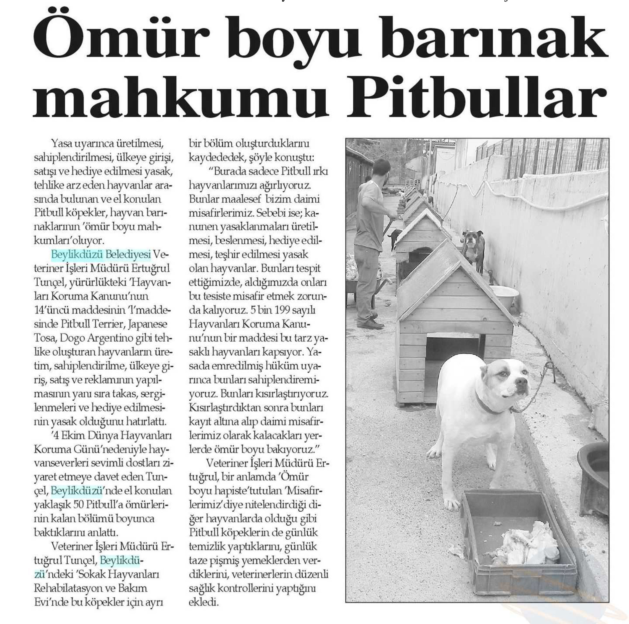 4 Ekim 2017 tarihli "İSTANBUL" gazetesi. Beylikdüzü Belediyesi Veteriner İşleri Müdürü Ertuğrul Tunçel, Pitbull Terrier, Japanese Tosa, Dogo Argentino gibi tehlike oluşturan hayvanların üretim, sahiplendirilme, ülkeye giriş, satış ve reklamının yapılmasının yanı sıra takas, sergilenmeleri ve hediye edilmesinin yasak olduğunu hatırlattı.