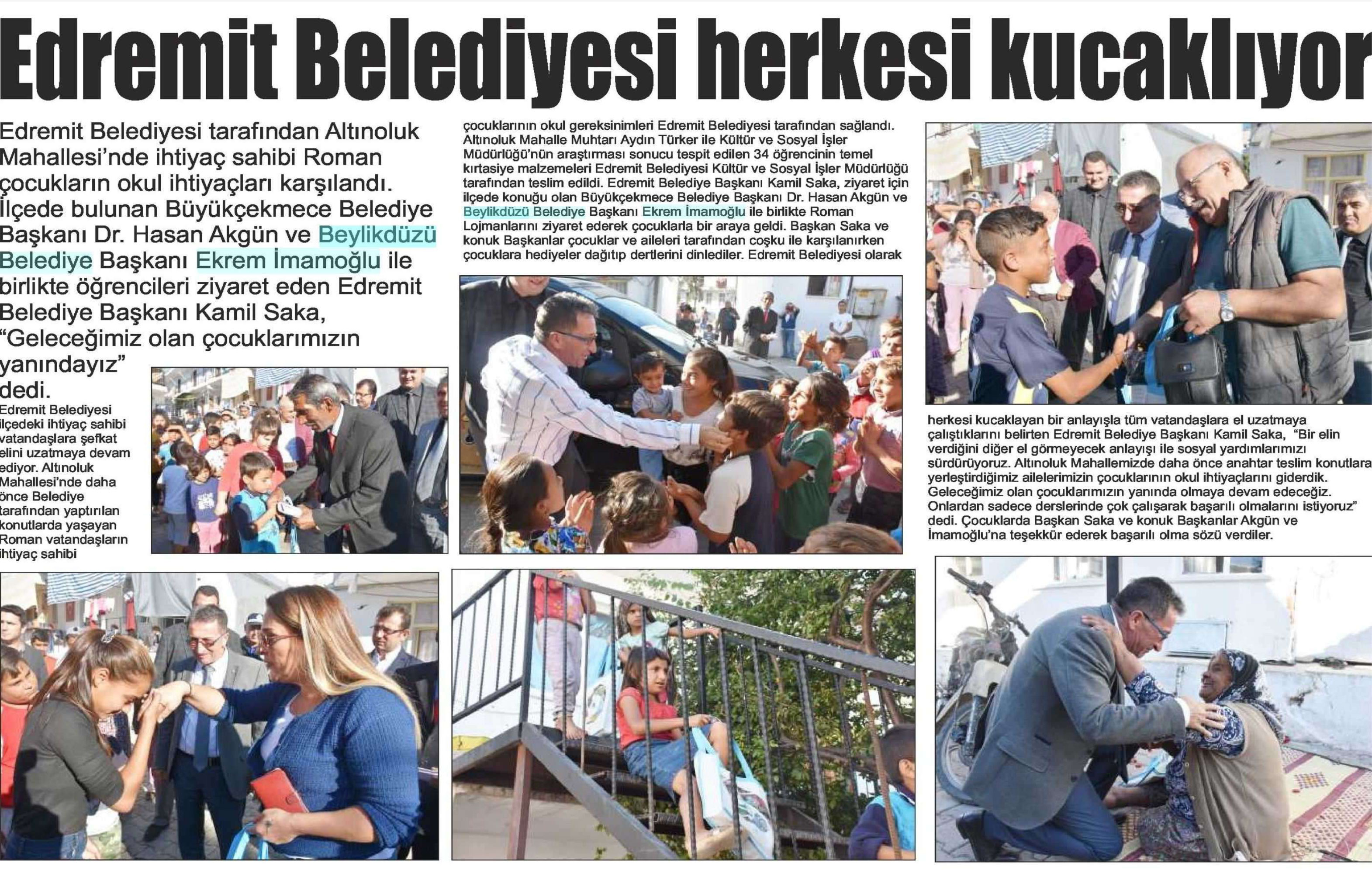 6 Ekim 2017 tarihli "NABIZ" gazetesi. Edremit Belediyesi tarafından Altınoluk Mahallesi'nde ihtiyaç sahibi Roman çocukların okul ihtiyaçları karşılandı. İlçede bulunan Büyükçekmece Belediye Başkanı Dr. Hasan Akgün ve Beylikdüzü Belediye Başkanı Ekrem İmamoğlu ile birlikte öğrencileri ziyaret eden Edremit Belediye Başkanı Kamil Saka, "Geleceğimiz olan çocuklarımızın yanındayız" dedi.