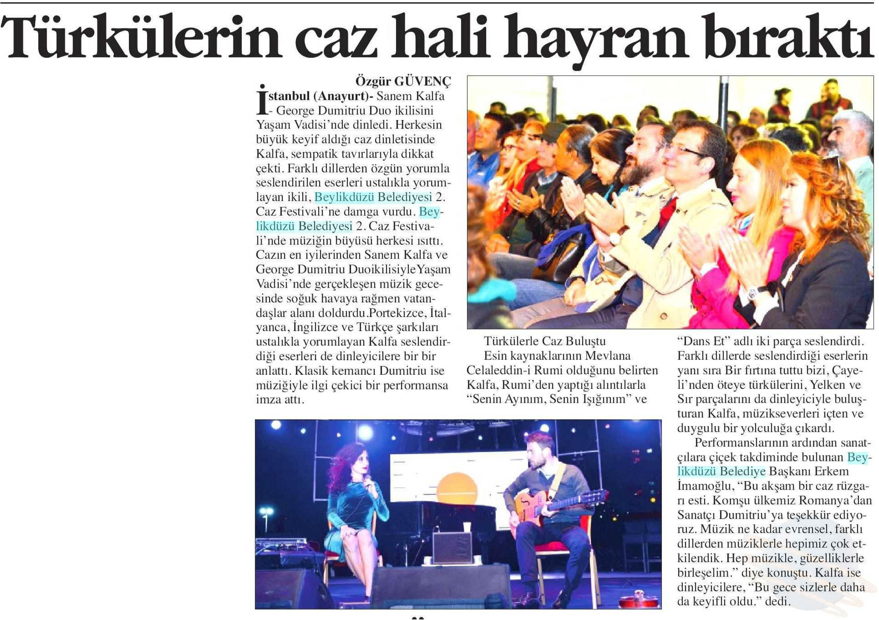 6 Ekim 2017 tarihli "ANAYURT" gazetesi. Sanem Kalfa - George Dumitriu Duo ikilisi Beylikdüzü Belediyesi 2. Caz Festivali'nde sahne aldı. Farklı dillerden özgün yorumla seslendiririlen eserleri ustalıkla yorumlayan ikili, büyük beğeni kazandı.