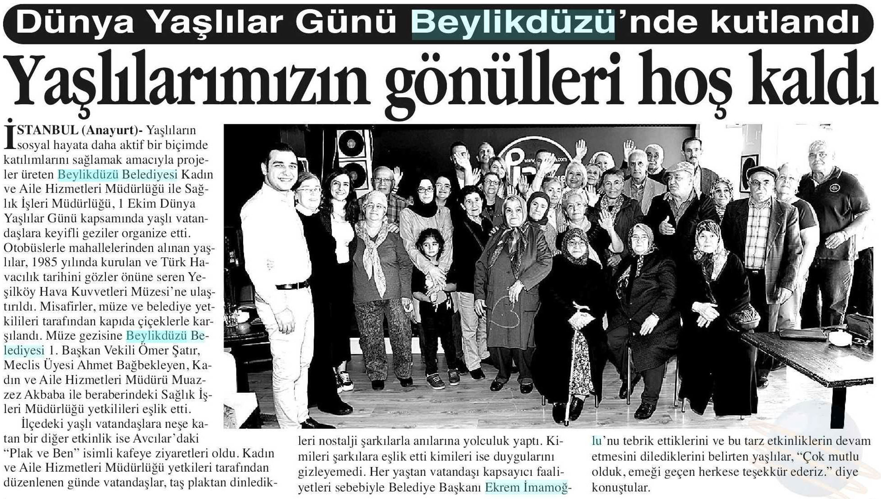 6 Ekim 2017 tarihli "ANAYURT" gazetesi. Beylikdüzü Belediyesi Kadın ve Aile Hizmetleri Müdürlüğü ile Sağlık İşleri Müdürlüğü 1 Ekim Dünya Yaşlılar Günü kapsamında yaşlı vatandaşlara keyifli geziler organize etti.