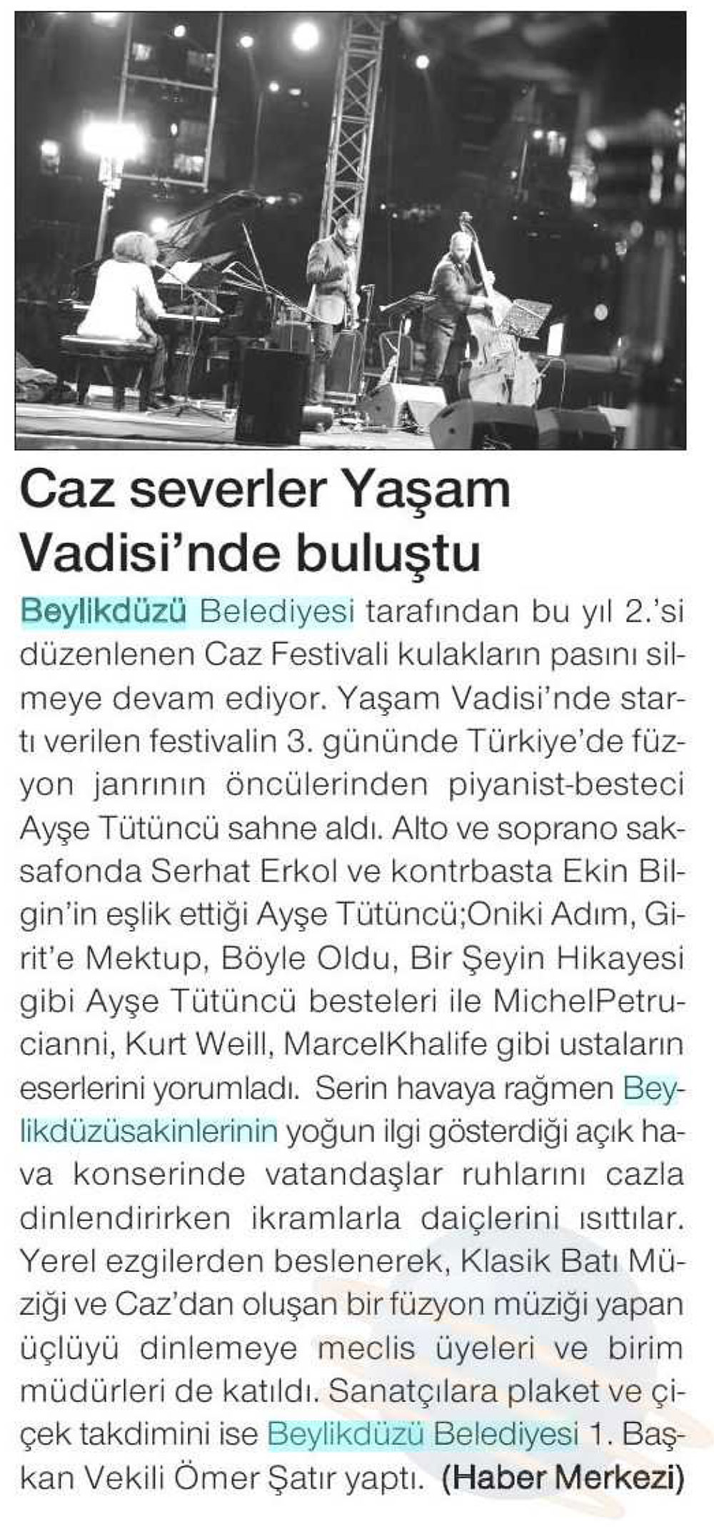 6 Ekim 2017 tarihli "HÜRSES" gazetesi. Beylikdüzü Belediyesi tarafından bu yıl 2.'si düzenlenen Caz Festivali kulakların pasını silmeye devam ediyor. Yaşam Vadisi'nde startı verilen festivalin 3.gününde piyanist besteci Ayşe Tütüncü sahne aldı.