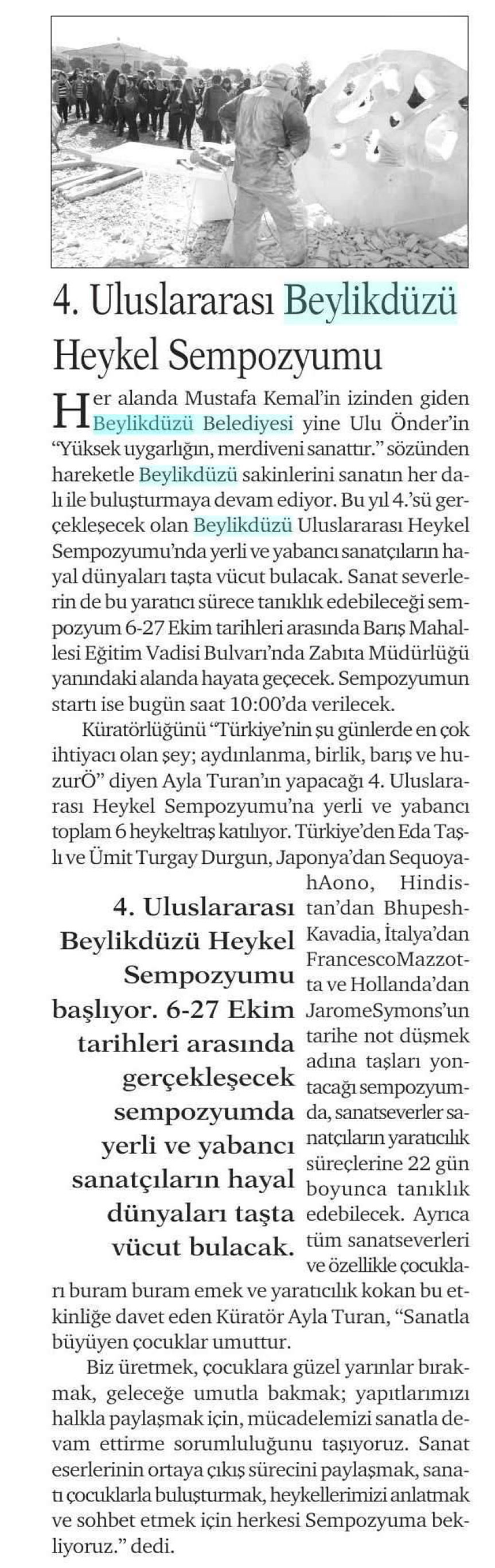 6 Ekim 2017 tarihli "HÜRSES" gazetesi. 4. Uluslararası Beylikdüzü Heykel Sempozyumu başlıyor. 6-27 Ekim tarihleri arasında gerçekleşecek sempozyumda yerli ve yabancı sanatçıların hayal dünyaları taşta vücut bulacak.