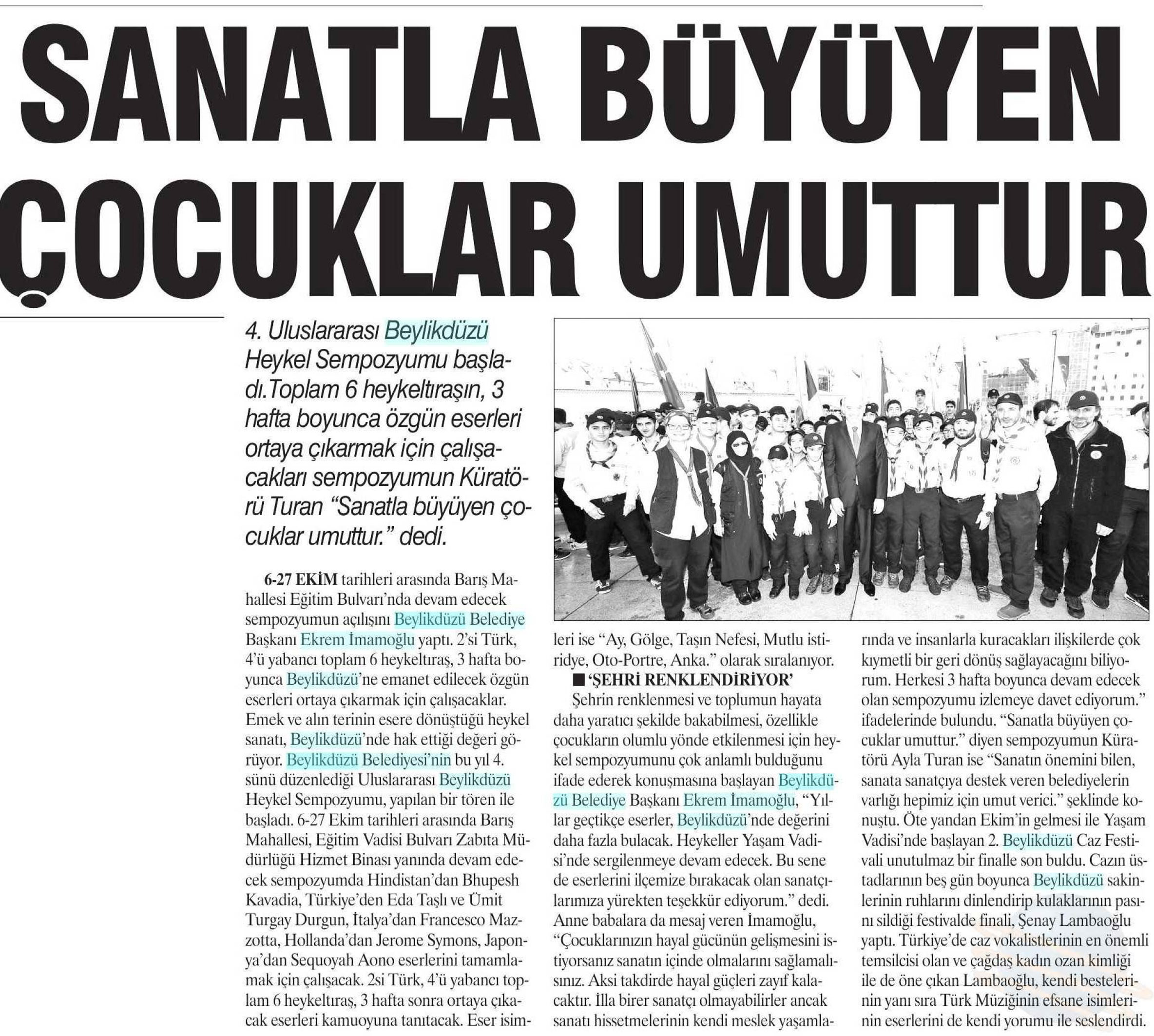 9 Ekim 2017 tarihli "DOKUZ SÜTUN" gazetesi. 4.Uluslararası Beylikdüzü Heykel sempozyumu başladı. Toplam 6 heykeltraşın, 3 hafta boyunca özgün eserleri ortaya çıkarmak için çalışacakları sempozyumun Küratörü Turan "Sanatla büyüyen çocuklar umuttur." dedi.