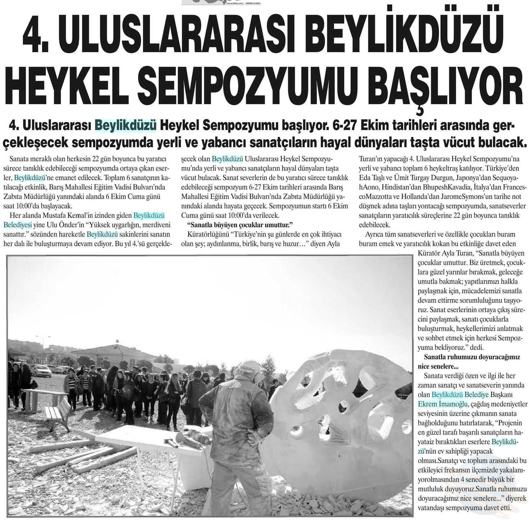 7 Ekim 2017 tarihli "YURT HABER" gazetesi. 4.Uluslararası Beylikdüzü Heykel Sempozyumu başlıyor. 6-27 Ekim tarihleri ararsında gerçekleşecek sempozyumda yerli ve yabancı sanatçıların hayal dünyaları taşta vücut bulacak.
