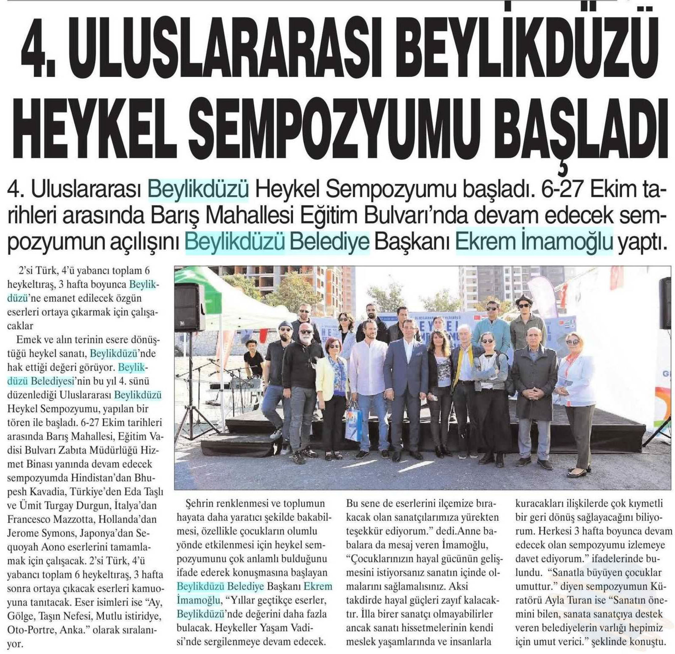 11 Ekim 2017 tarihli "BÜYÜKÇEKMECE" gazetesi. 4.Uluslararası Beylikdüzü Heykel Sempozyumu başladı. 6-27 Ekim tarihleri arasında Barış Mahallesi Eğitim Bulvarı'nda devam edecek sempozyumun açılışını Beylikdüzü Belediye Başkanı Ekrem İmamoğlu yaptı.